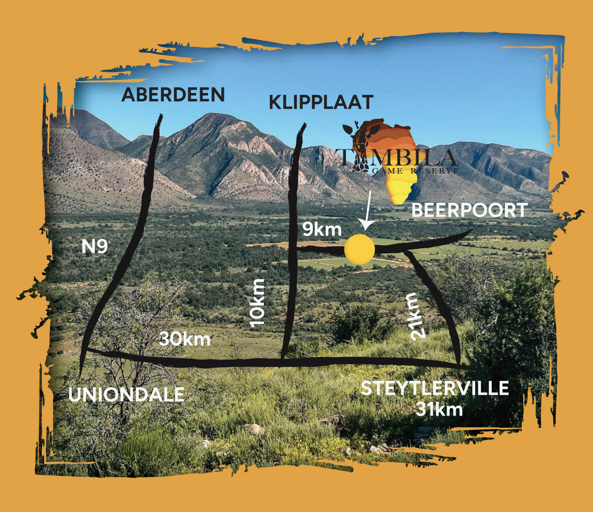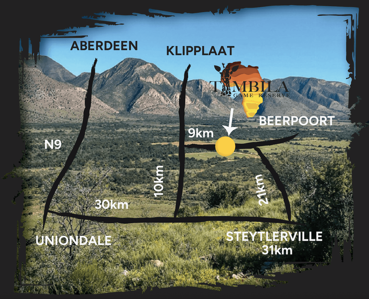 Travel along the N9 and take the Steytlerville turnoff just North of Willowmore onto the R329. Please be aware that this road changes into a single lane width concrete road with gravel shoulders, so travel safely! Travel 30km along this road, then take the Klipplaat turnoff to the left (Timbila signpost at the turn). This road is gravel only. Travel along this road for 10km and turn right towards Bierpoort just after the Fullarton shop (Timbila signpost at the turnoff). Timbila Game Reserve Reception will be on your right hand side after 7kms.