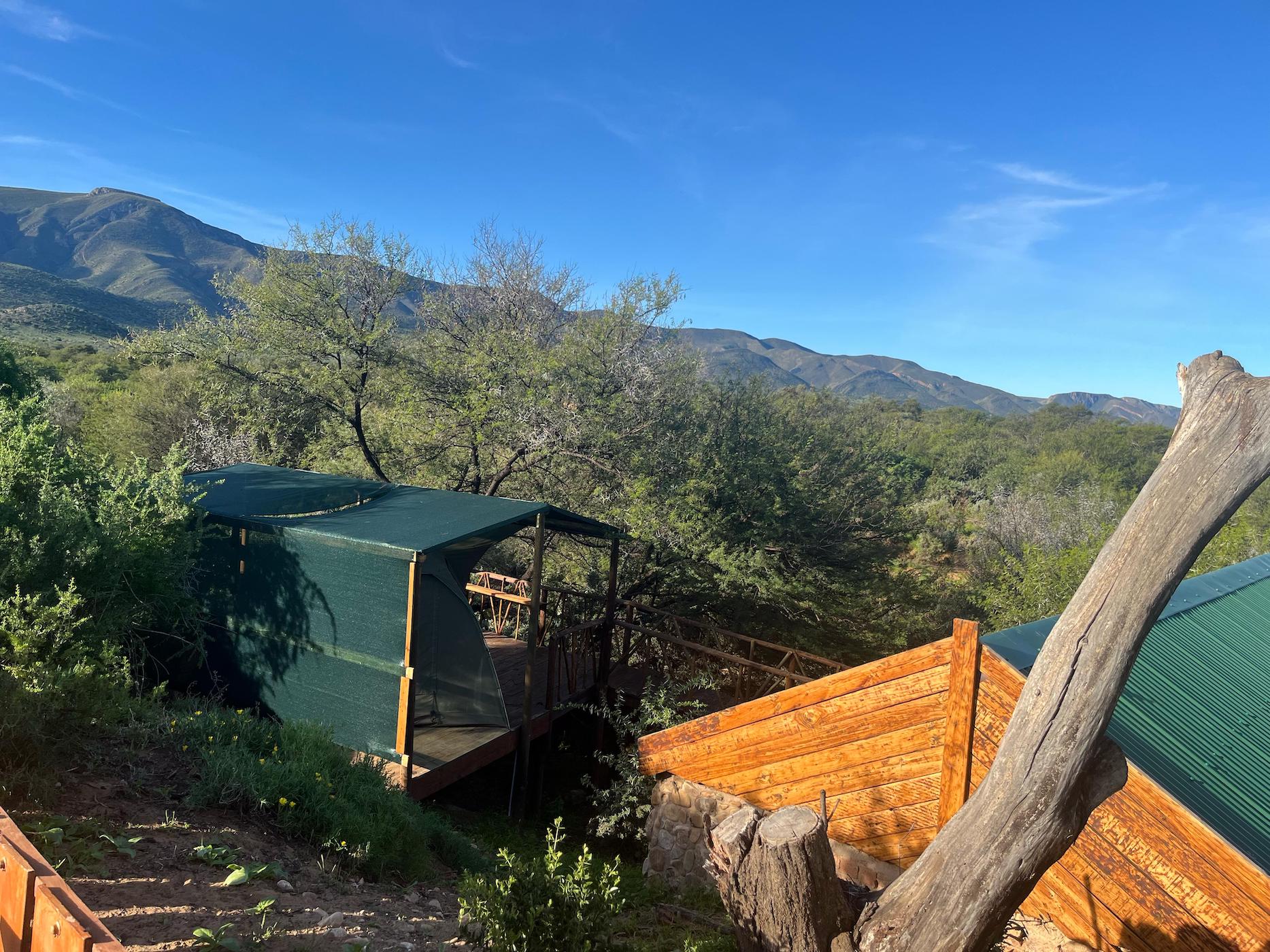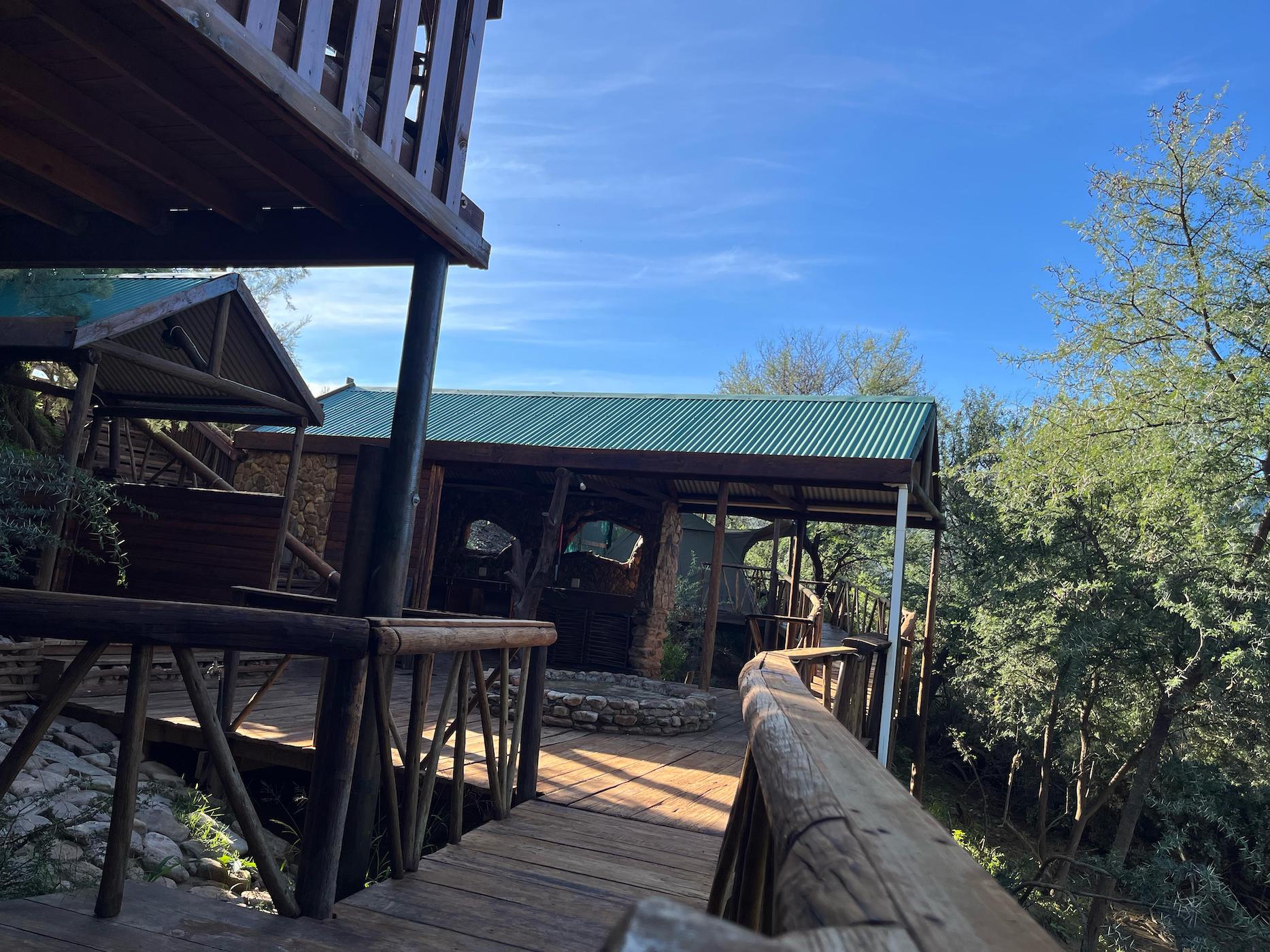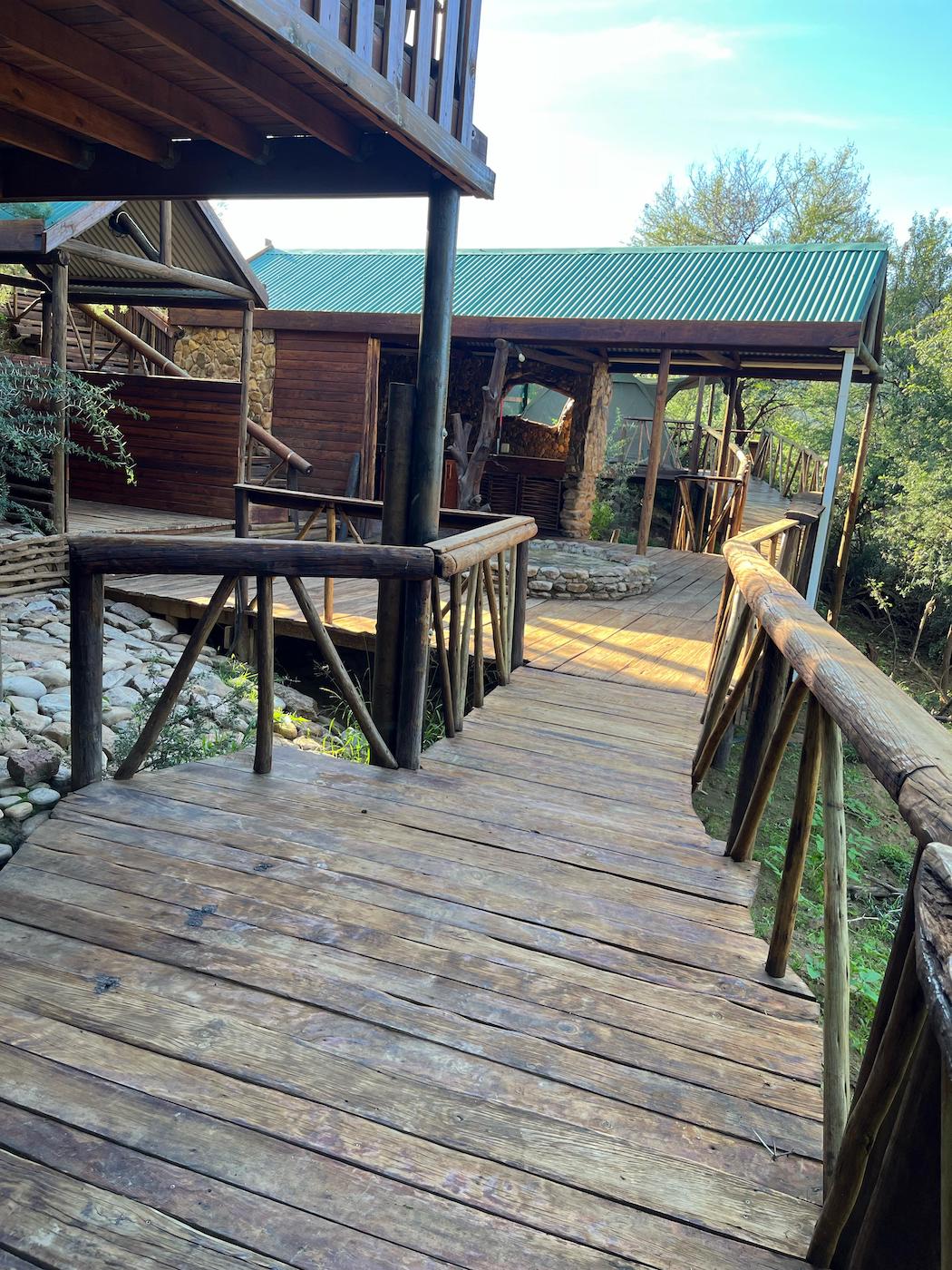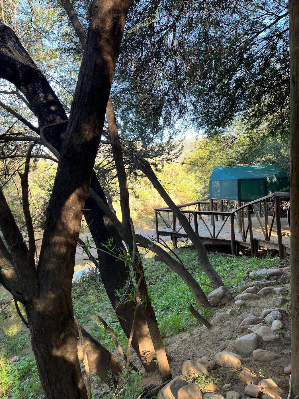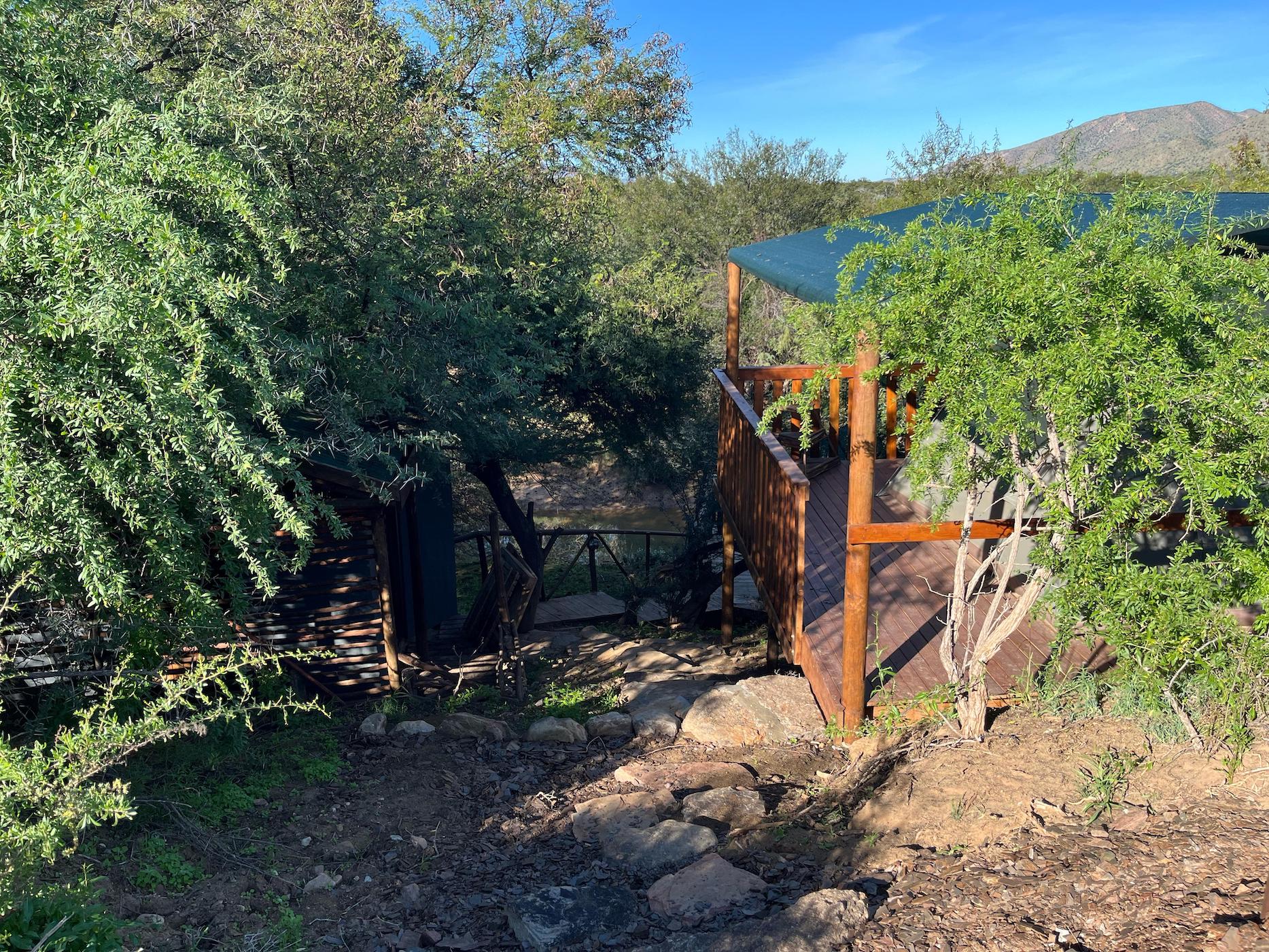 Built into the bank of the Groot River, you have to descend a few steps to get to the wooden walkways that interconnect the tents and bathrooms of this camp, while providing a lovely view across the river and down the Groot River valley.
