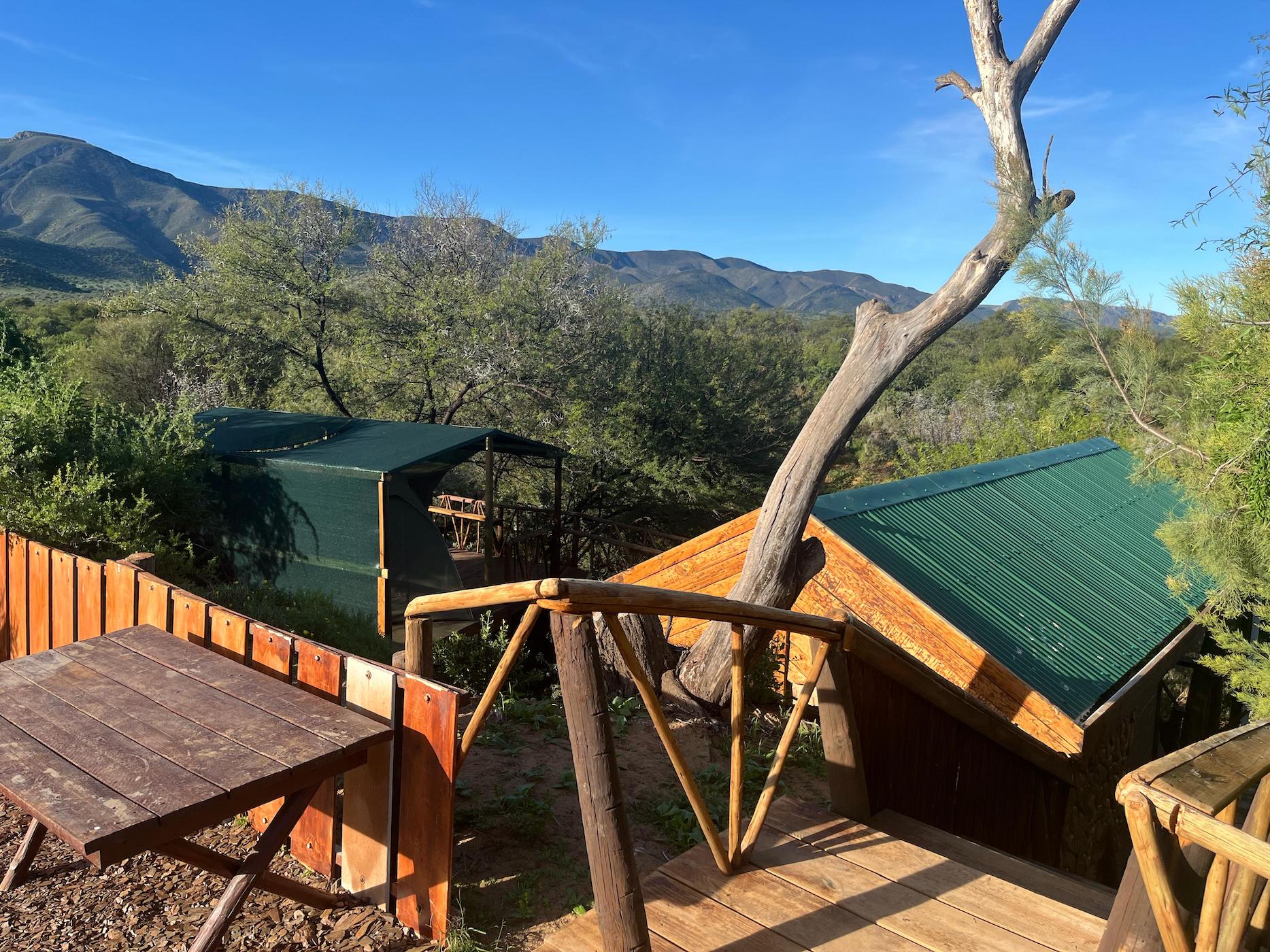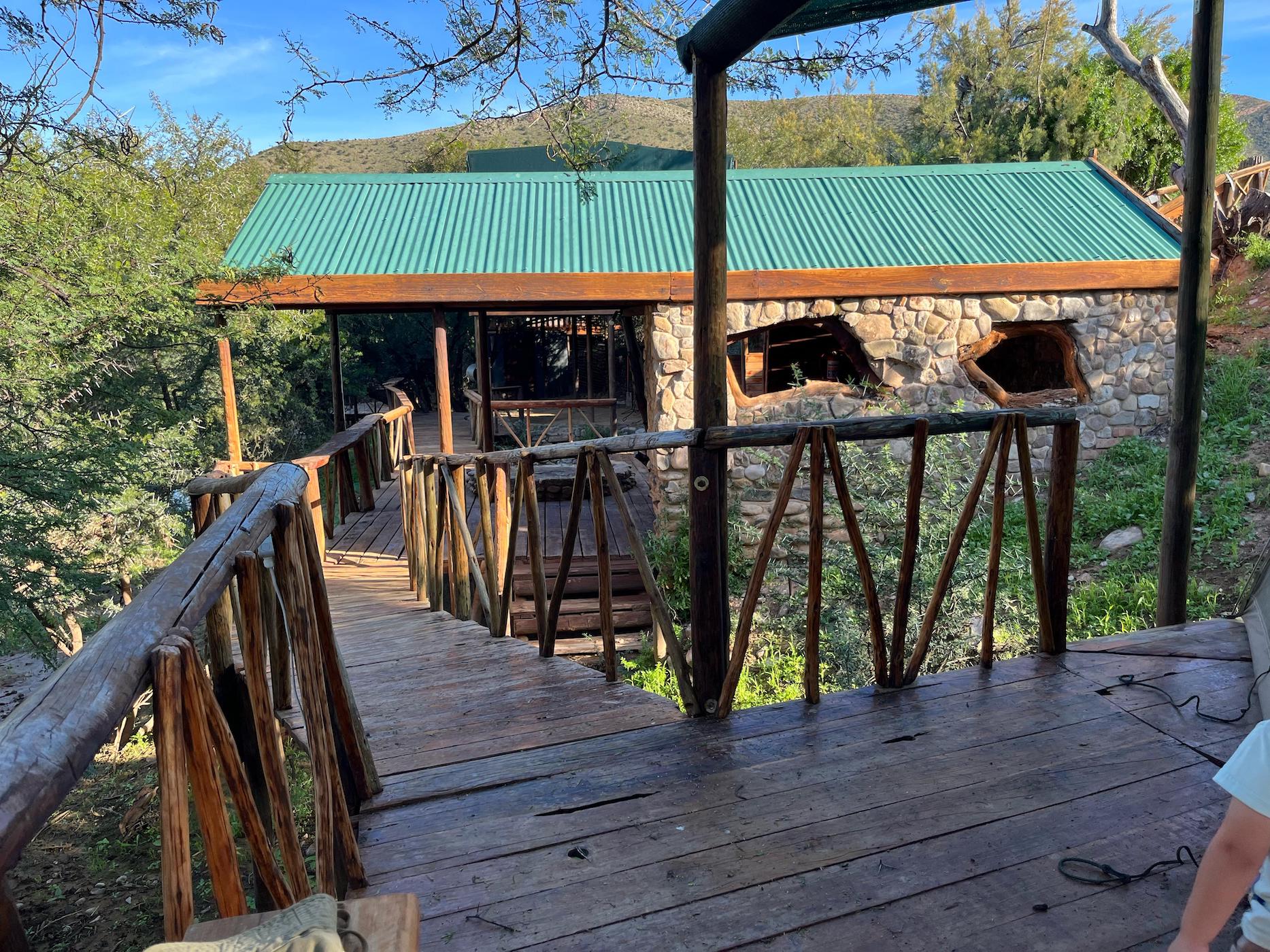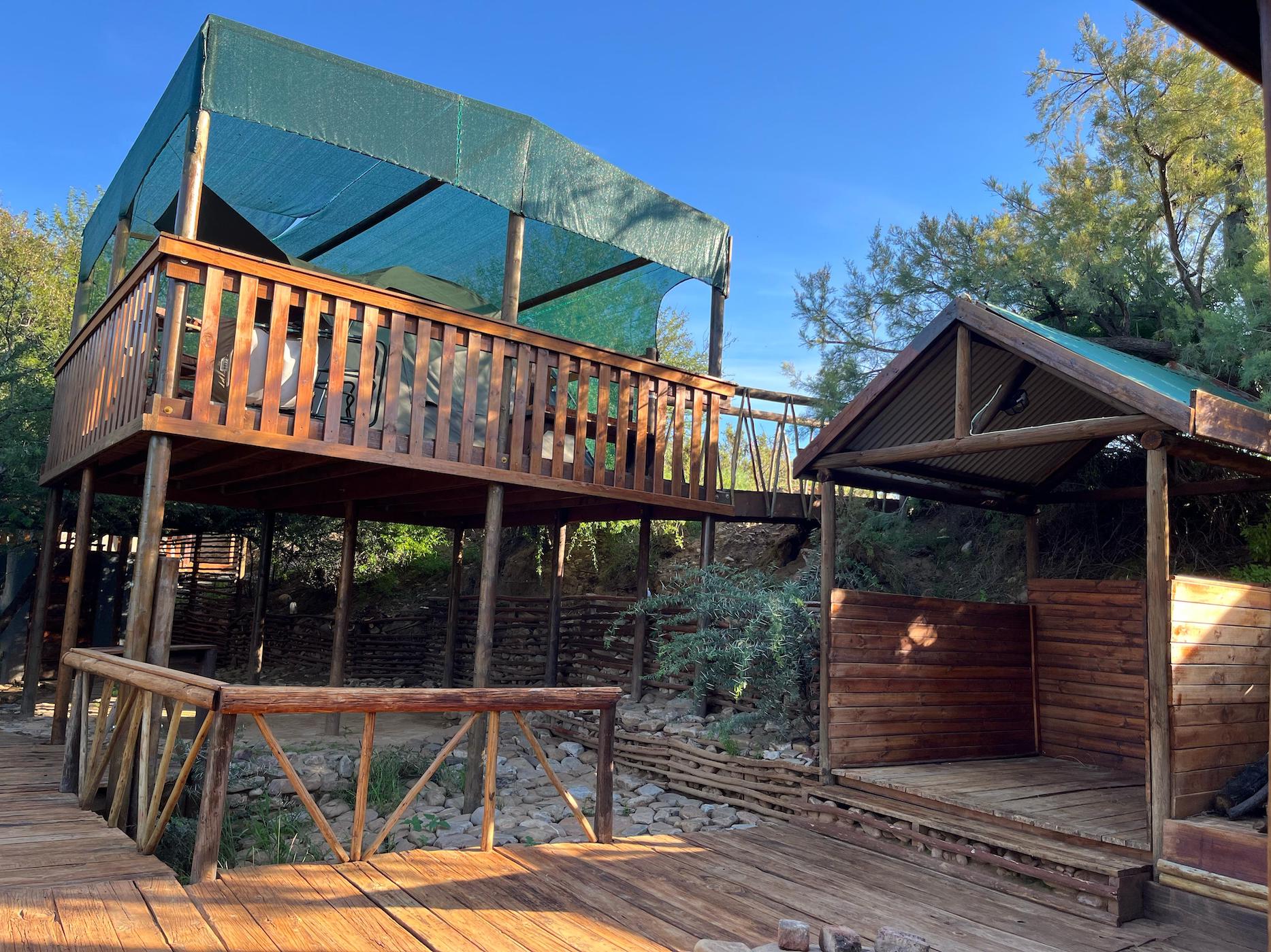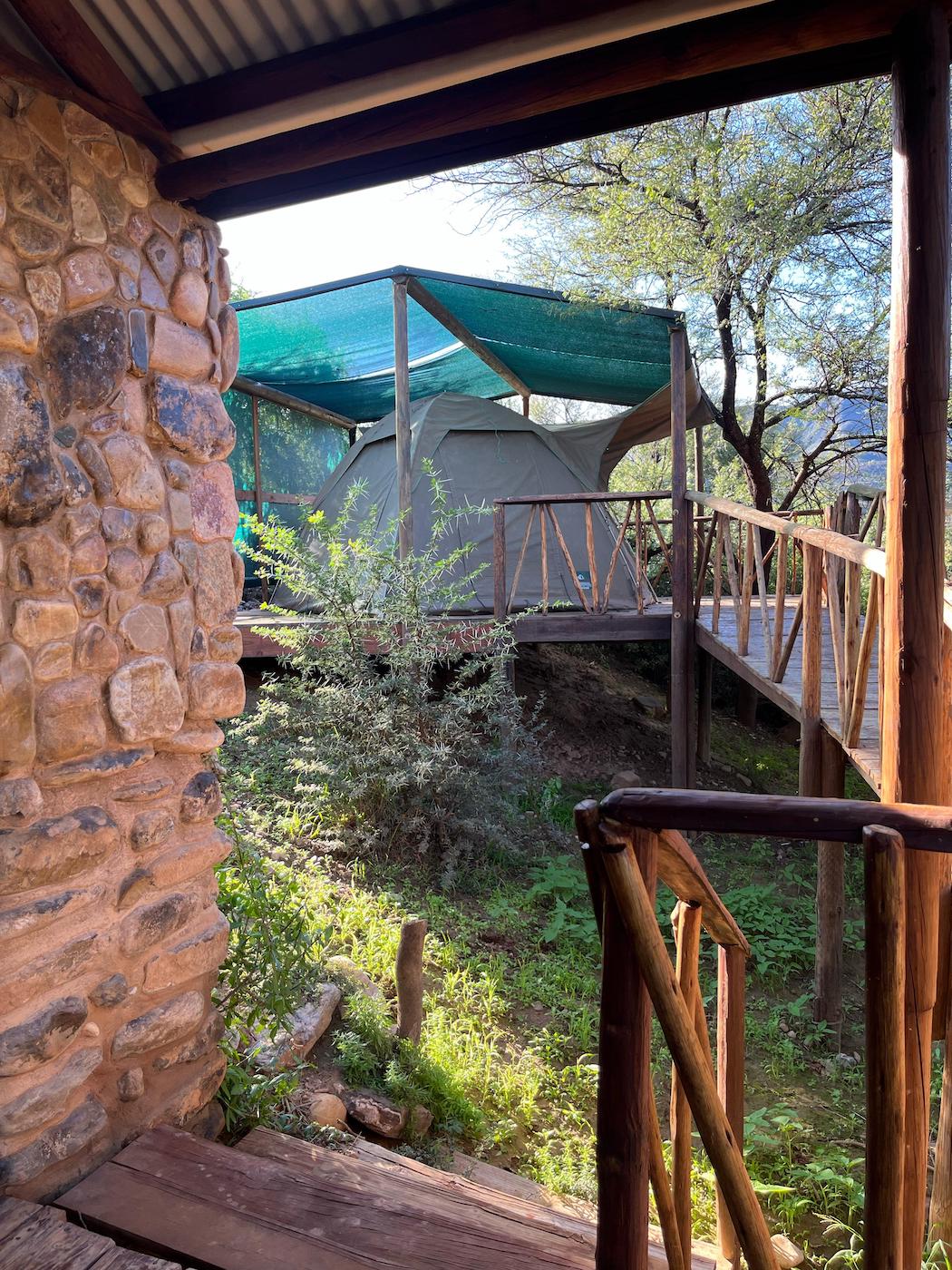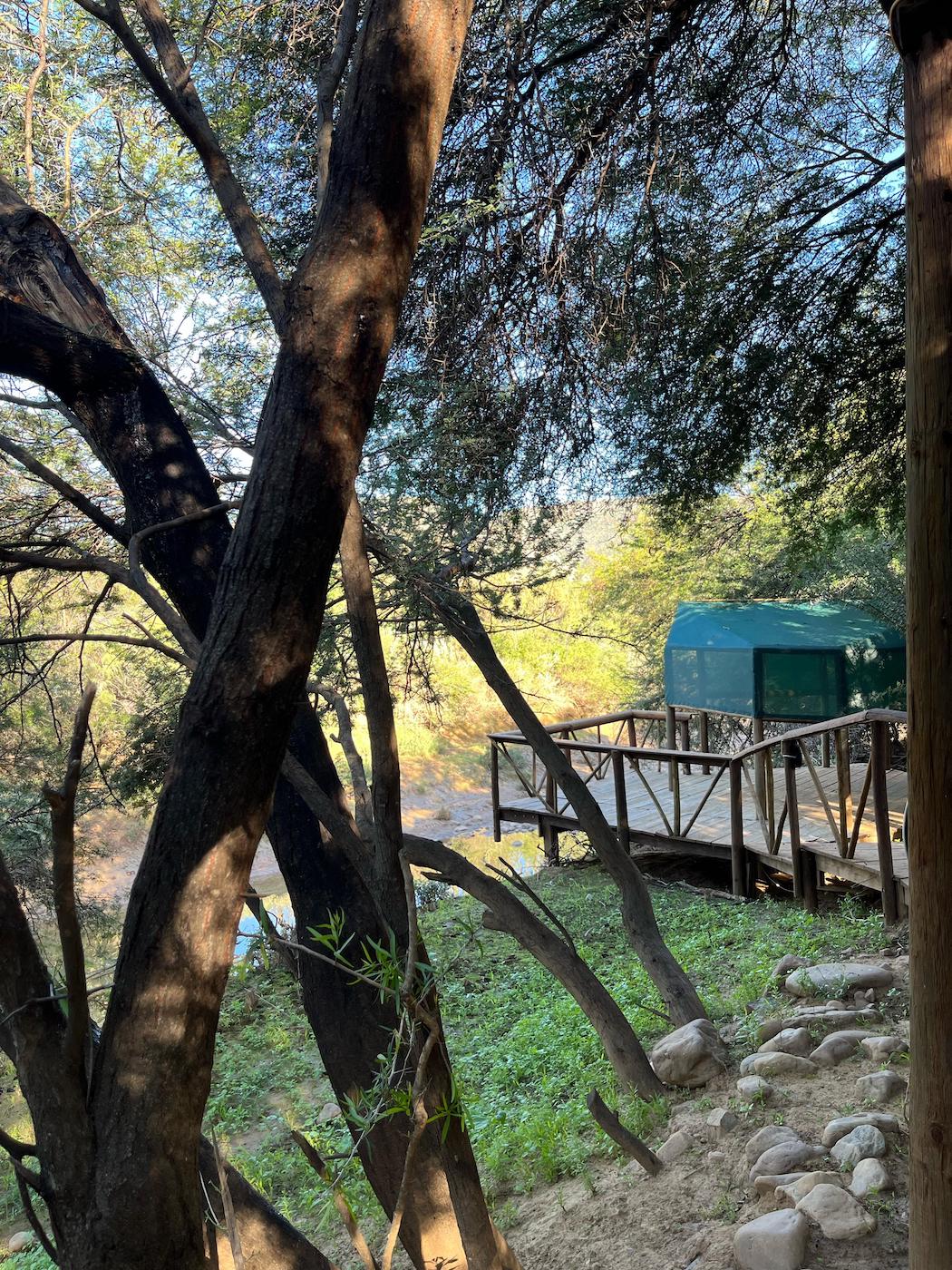 Built into the bank of the Groot River, you have to descend a few steps to get to the wooden walkways that interconnect the tents and bathrooms of this camp, while providing a lovely view across the river and down the Groot River valley.