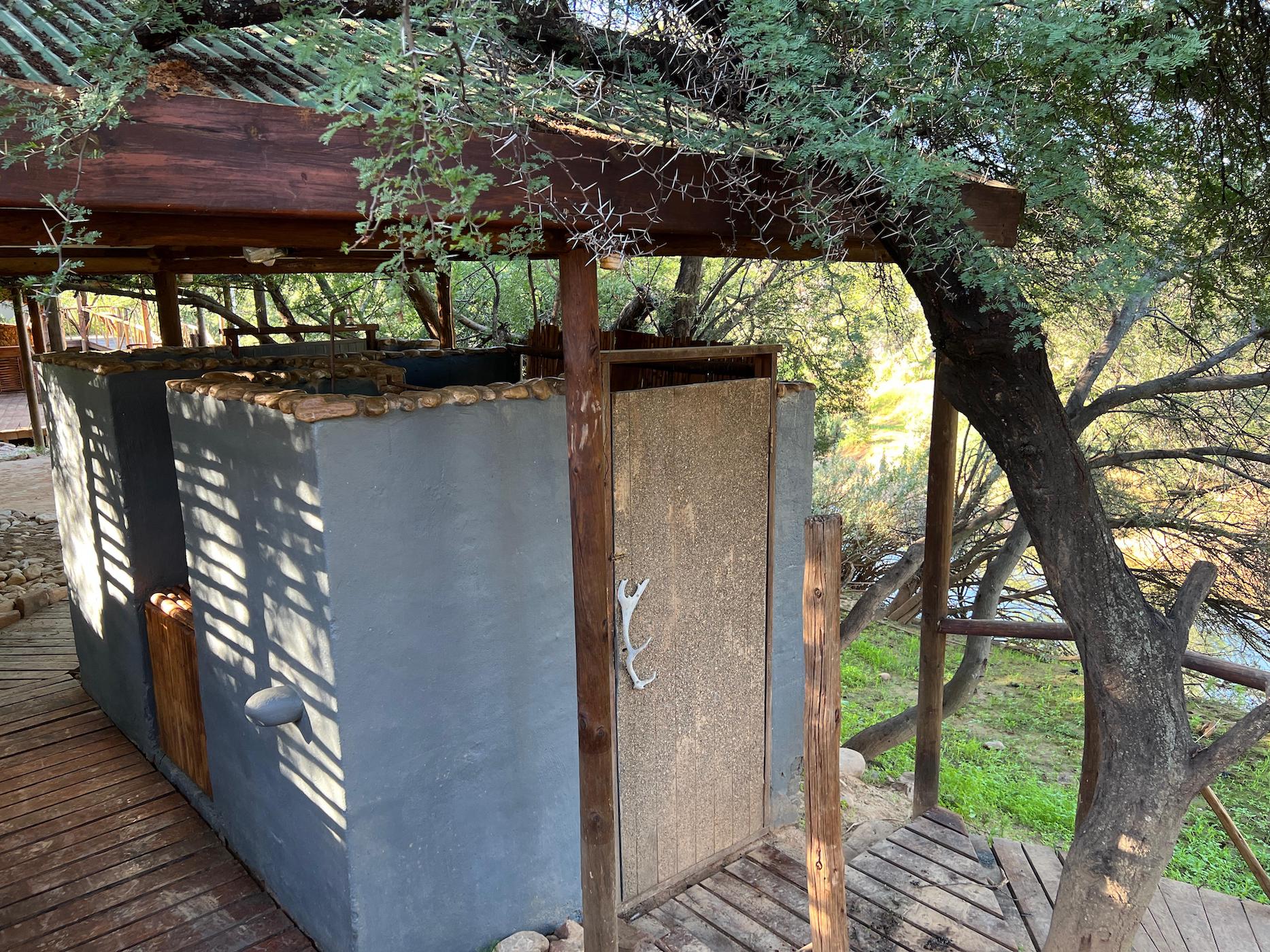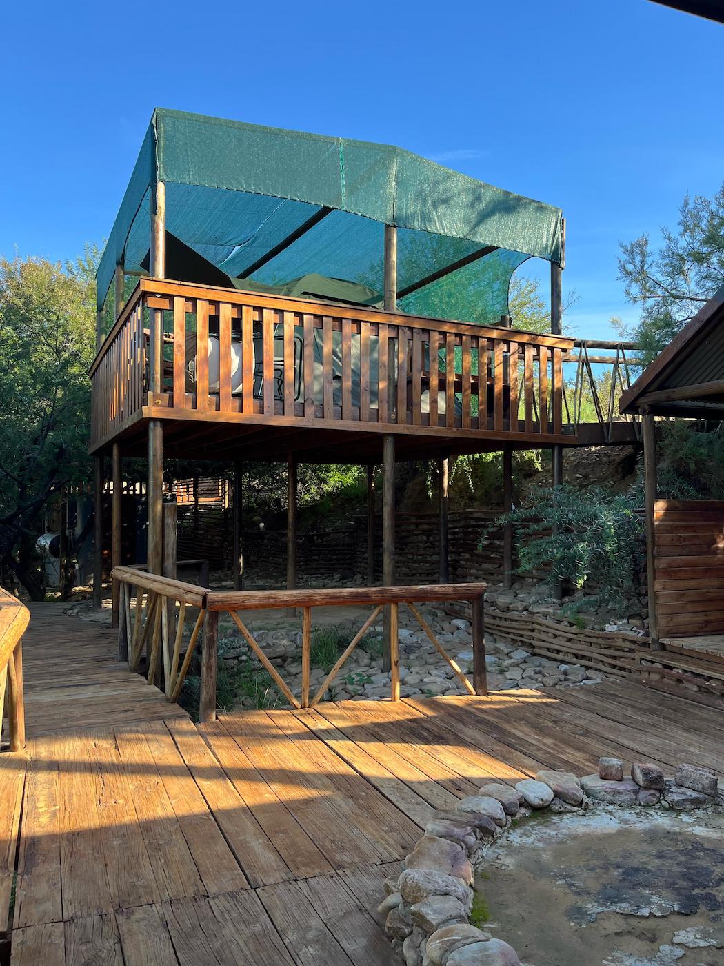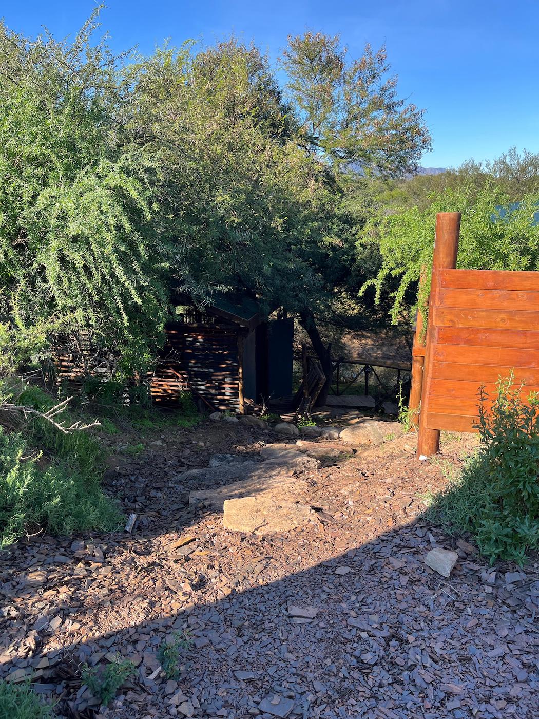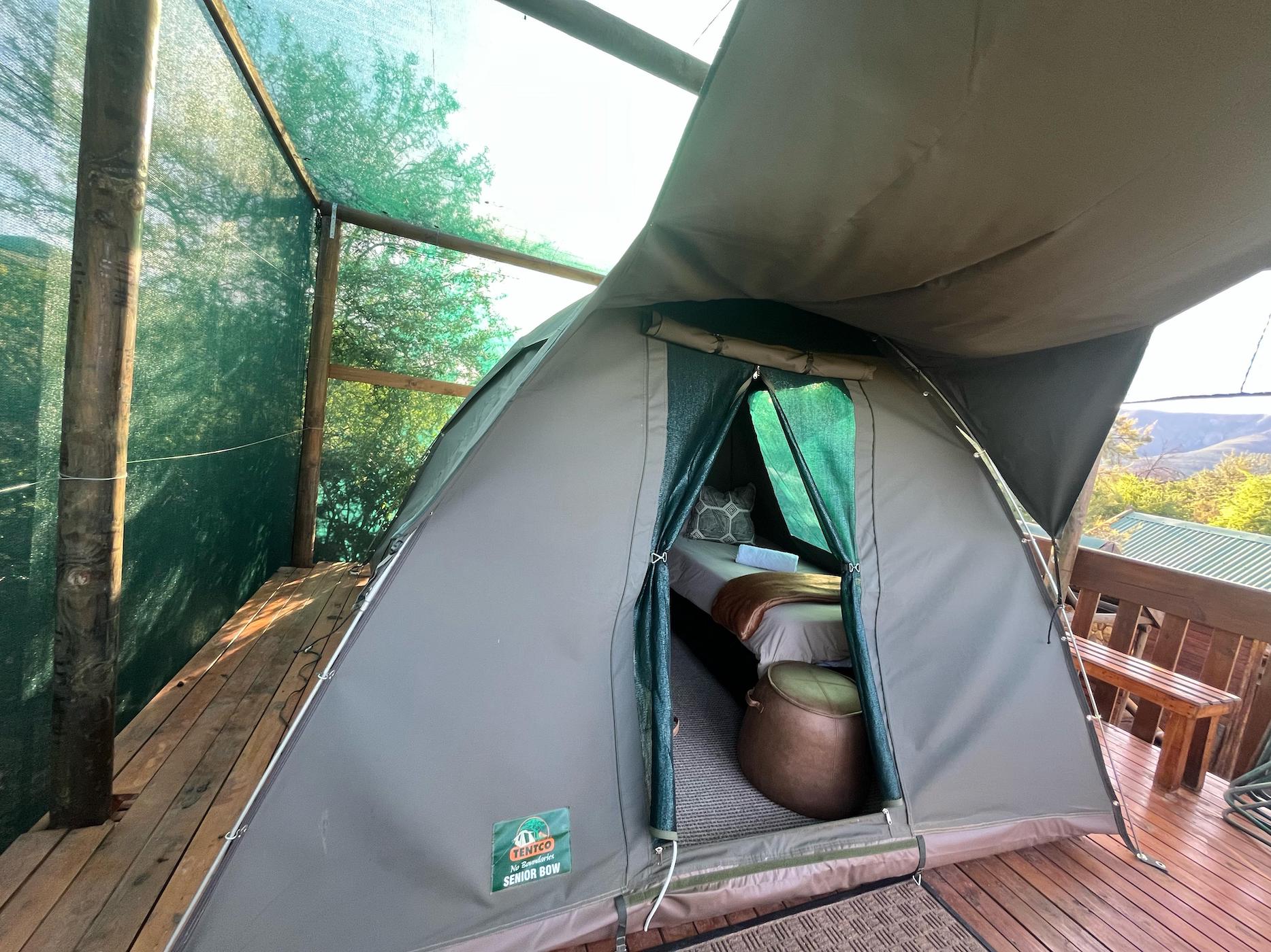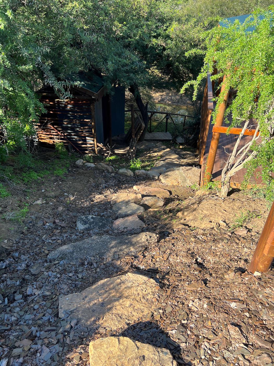 Built into the bank of the Groot River, you have to descend a few steps to get to the wooden walkways that interconnect the tents and bathrooms of this camp, while providing a lovely view across the river and down the Groot River valley.
