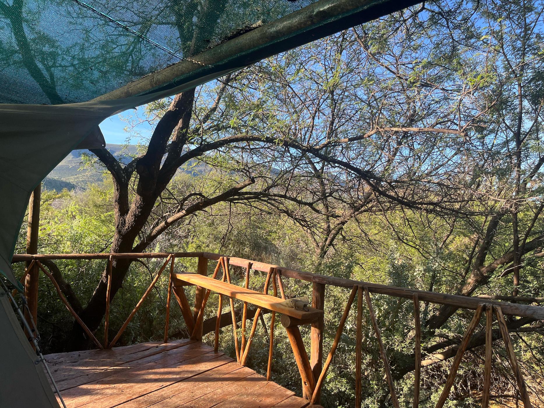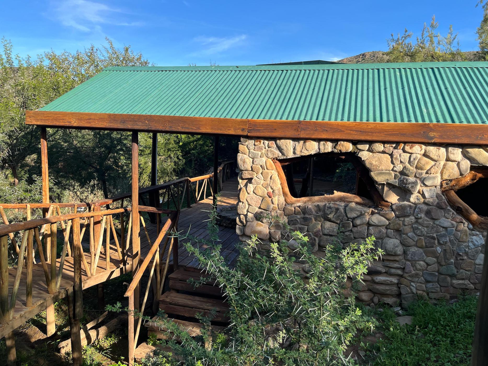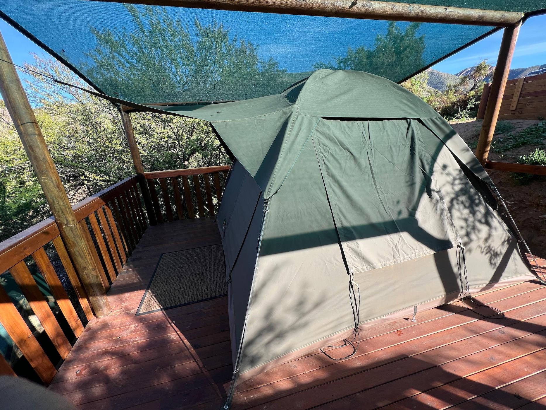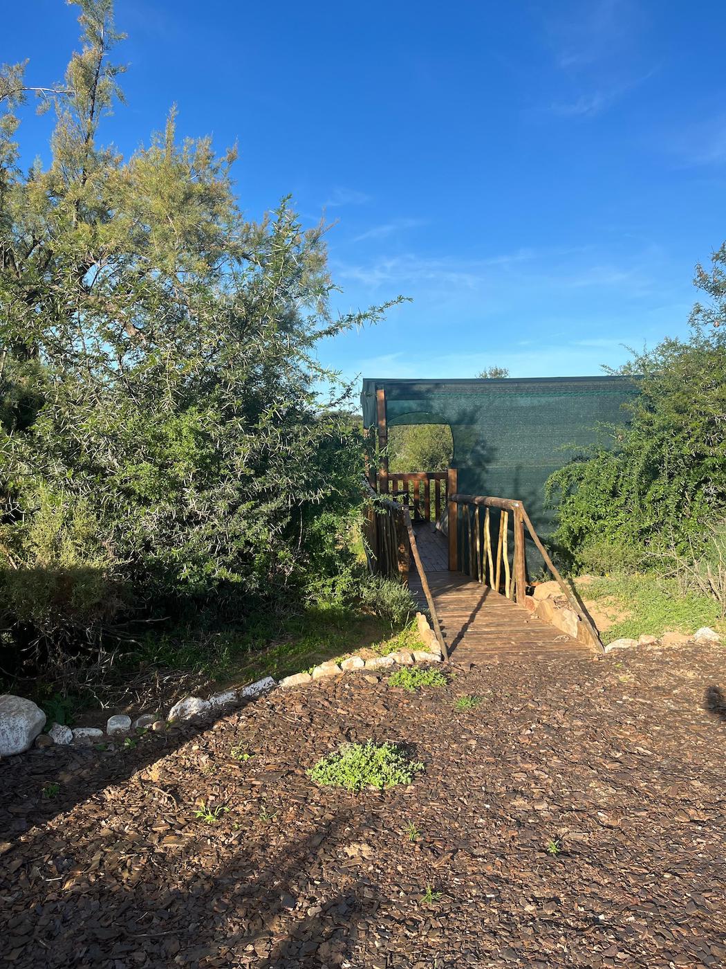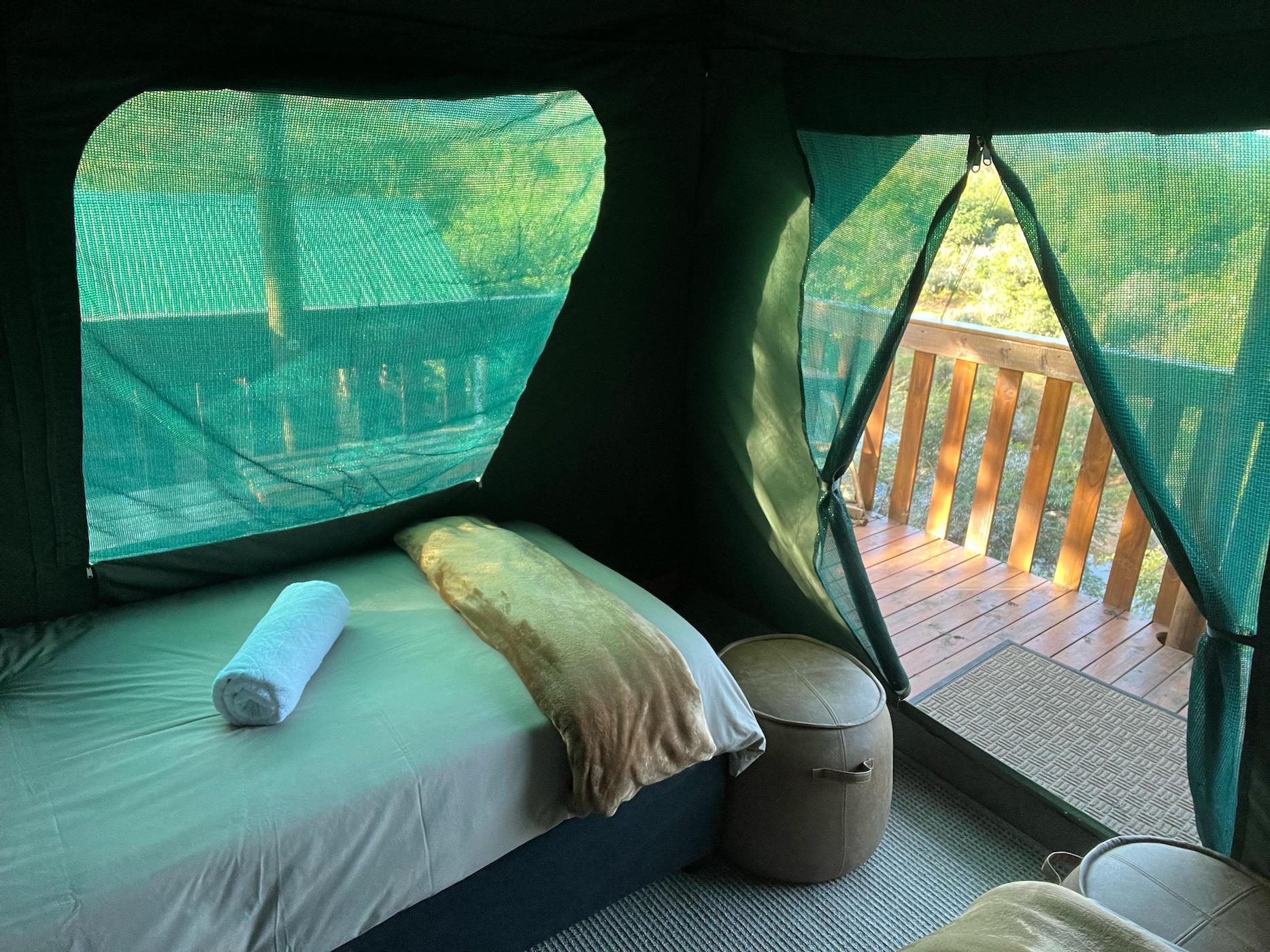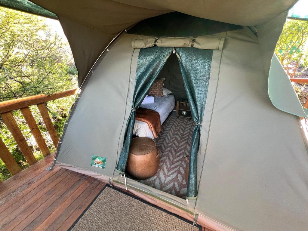 Built into the bank of the Groot River, you have to descend a few steps to get to the wooden walkways that interconnect the tents and bathrooms of this camp, while providing a lovely view across the river and down the Groot River valley.