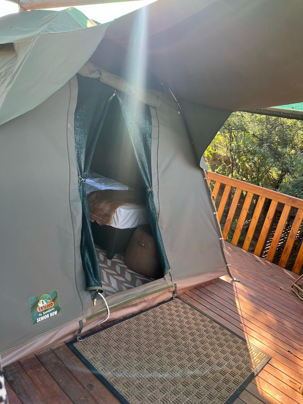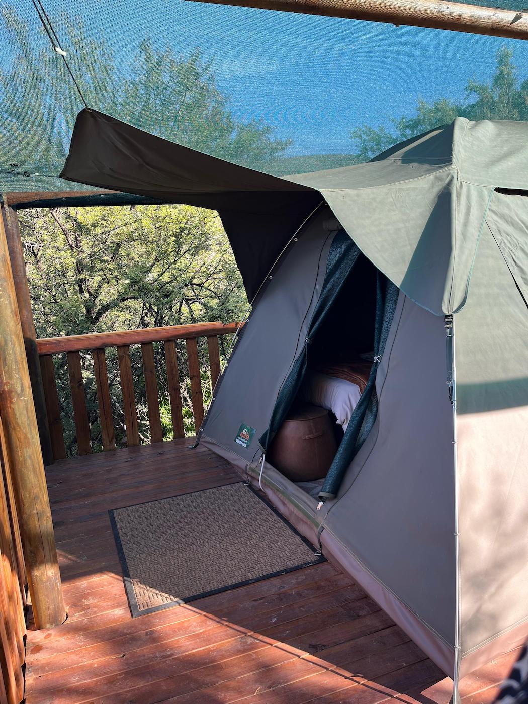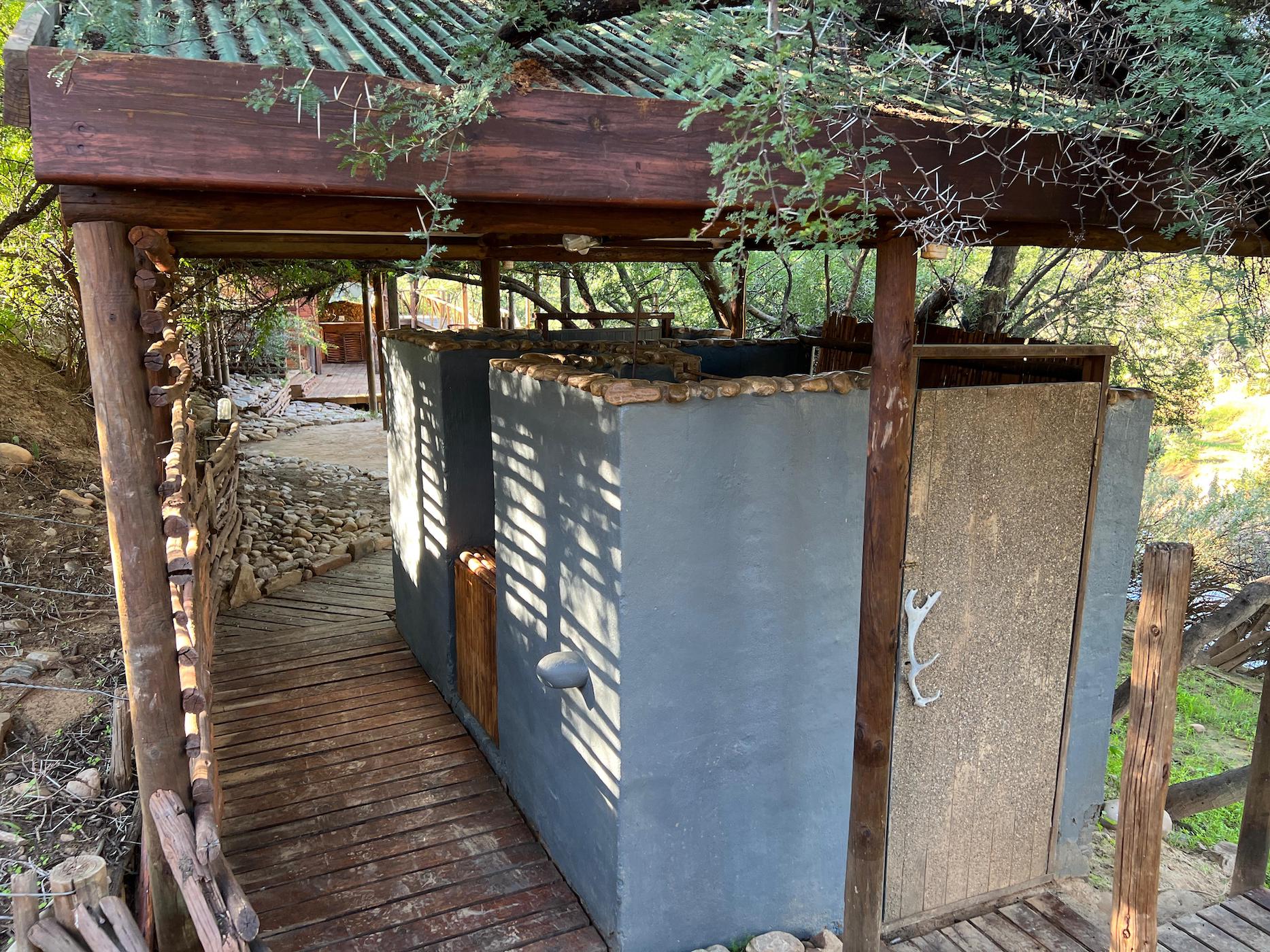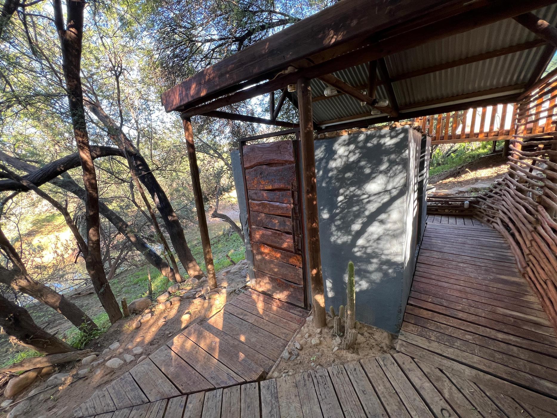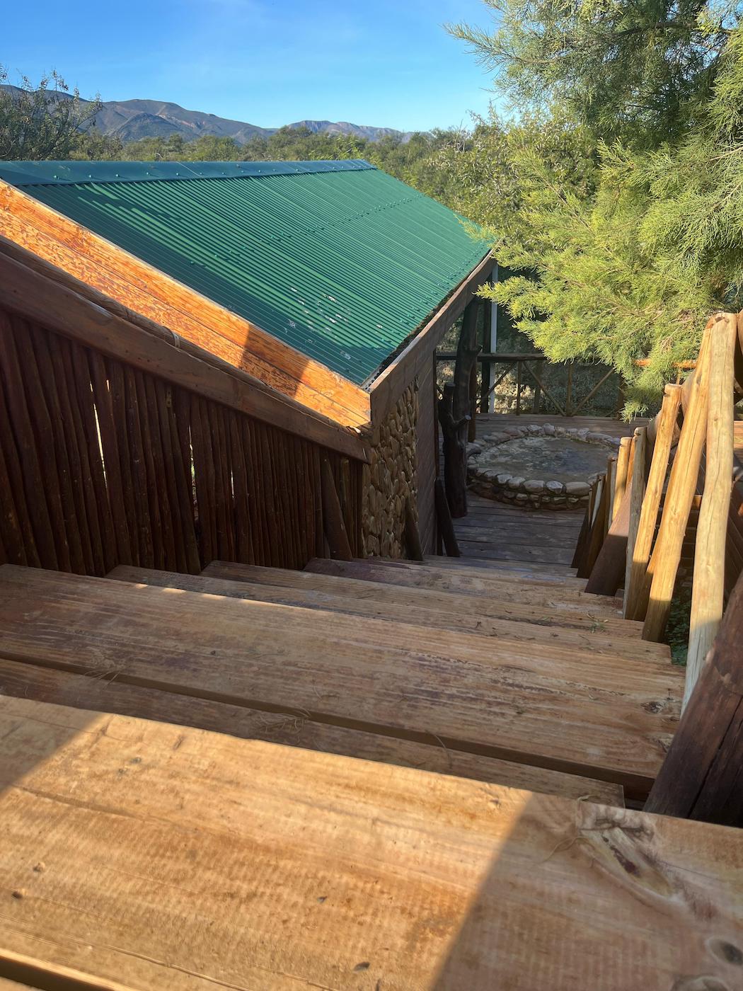 Built into the bank of the Groot River, you have to descend a few steps to get to the wooden walkways that interconnect the tents and bathrooms of this camp, while providing a lovely view across the river and down the Groot River valley.