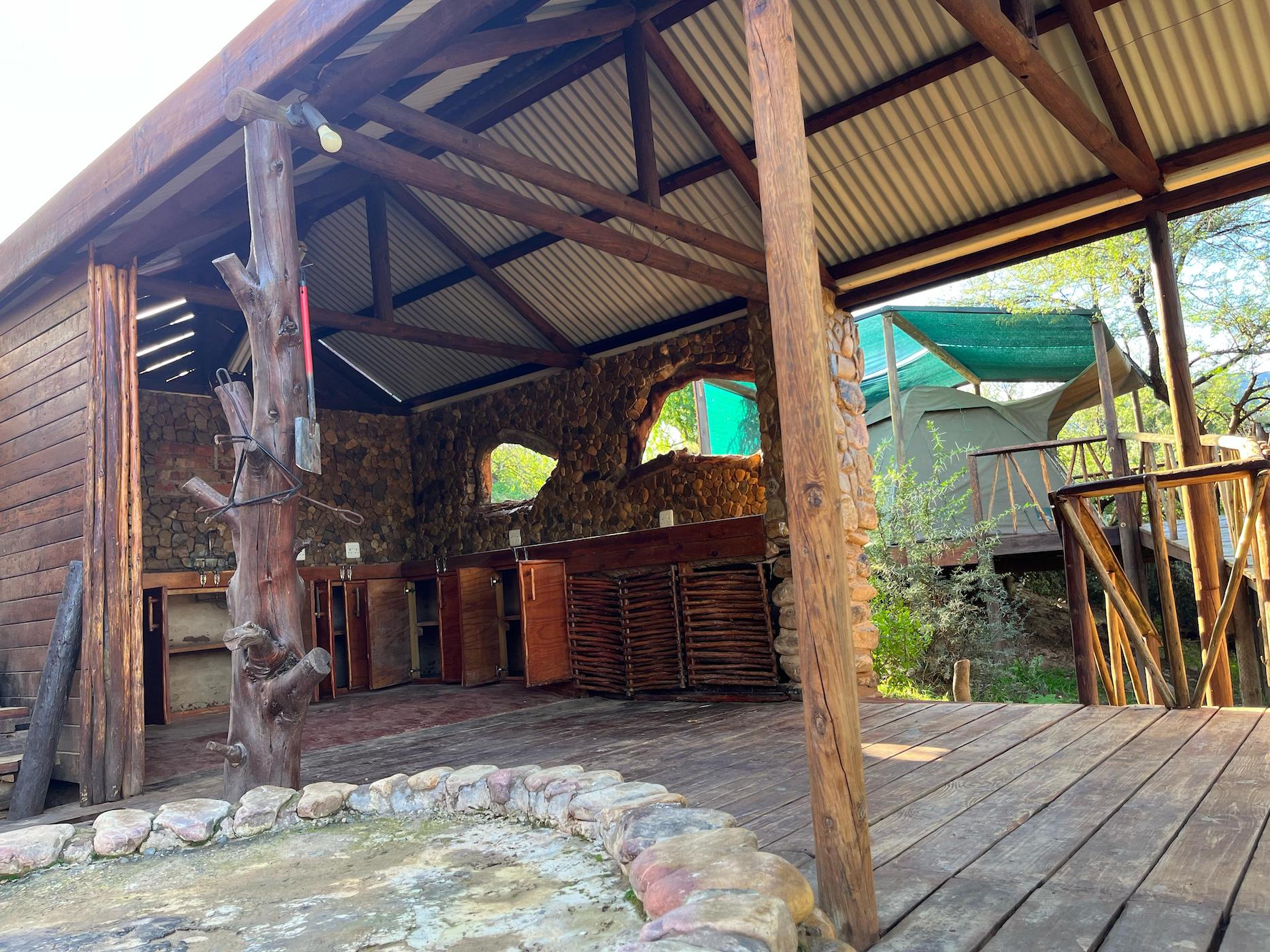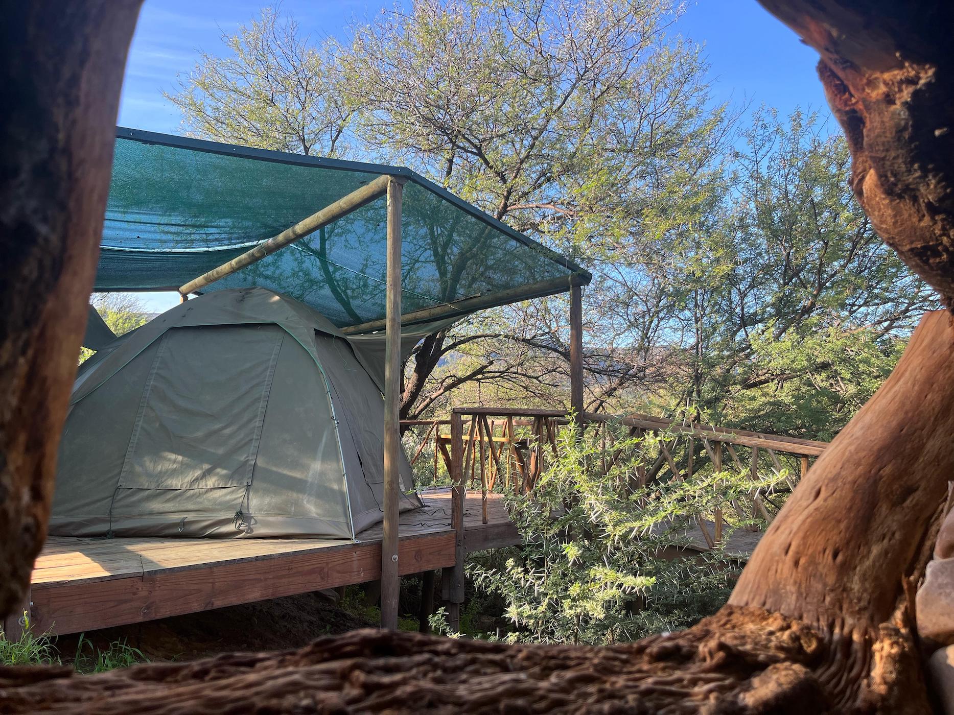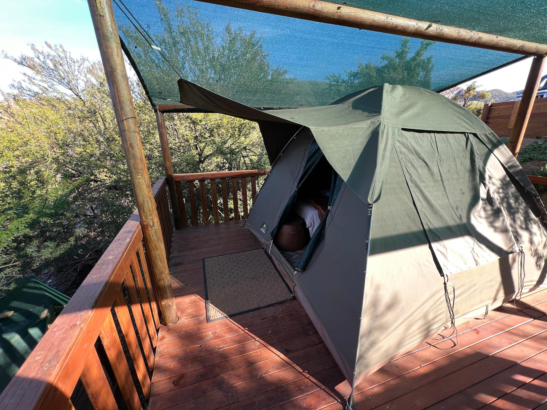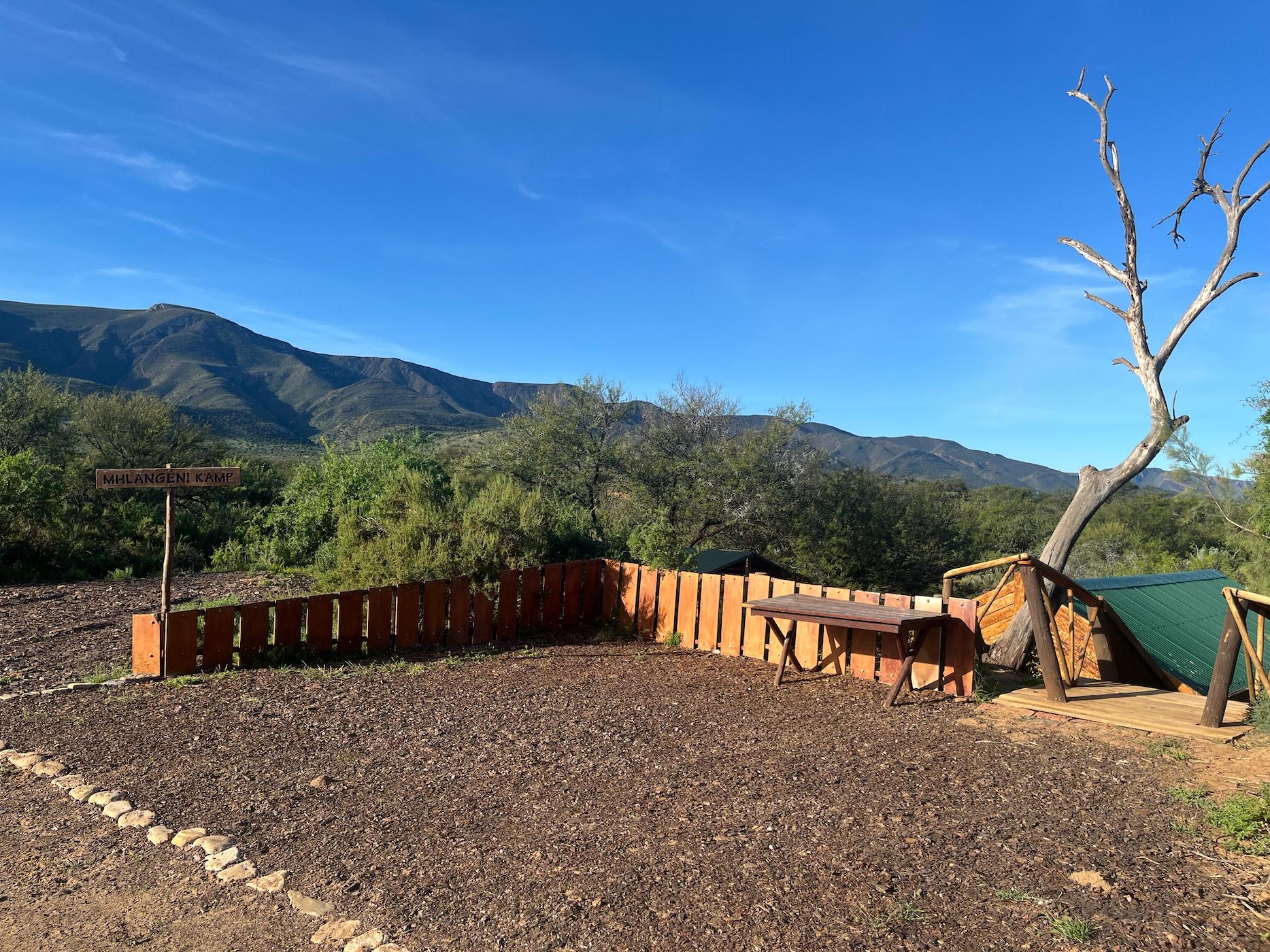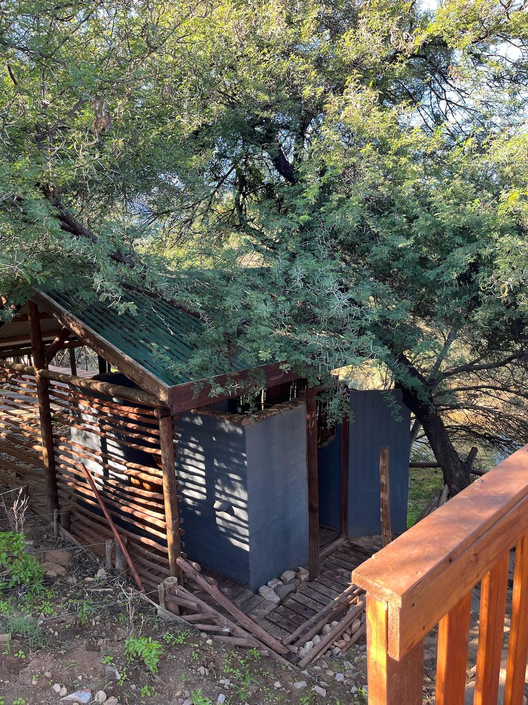 Built into the bank of the Groot River, you have to descend a few steps to get to the wooden walkways that interconnect the tents and bathrooms of this camp, while providing a lovely view across the river and down the Groot River valley.