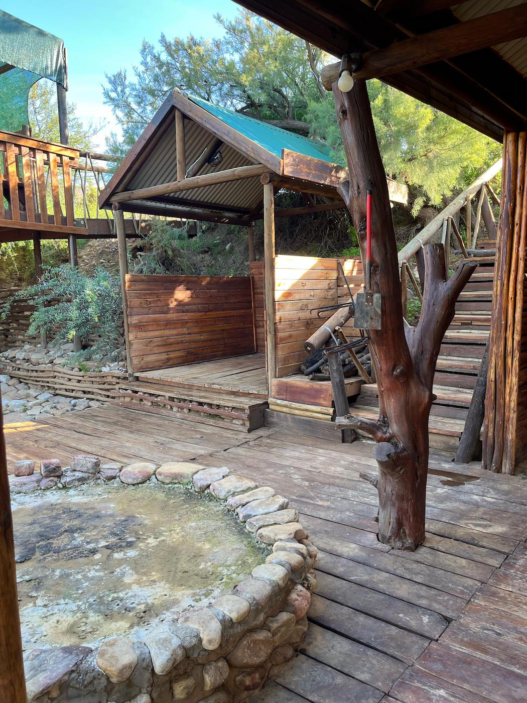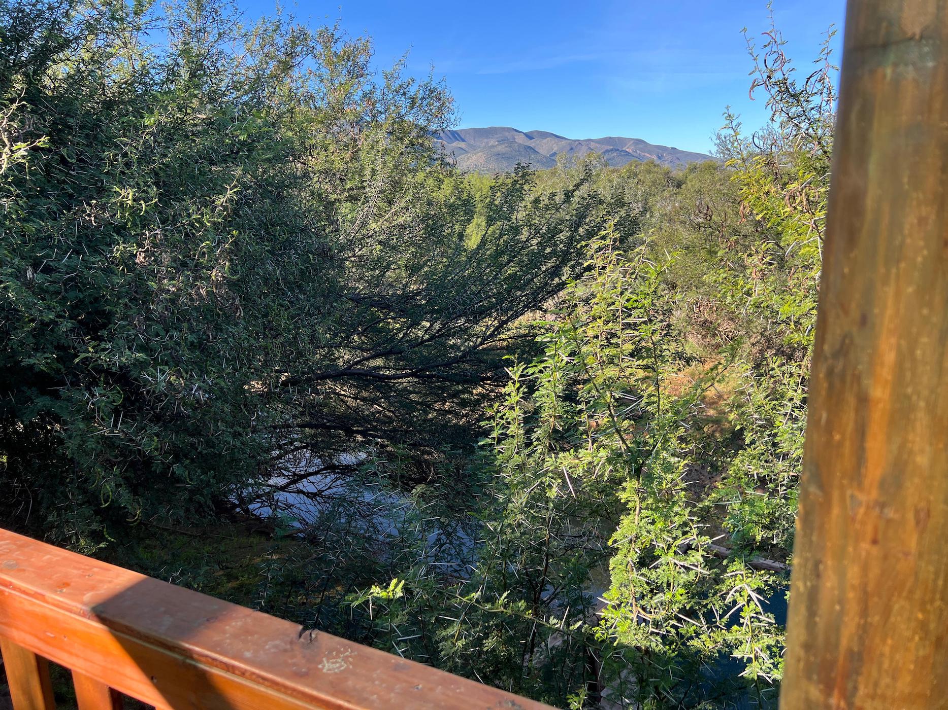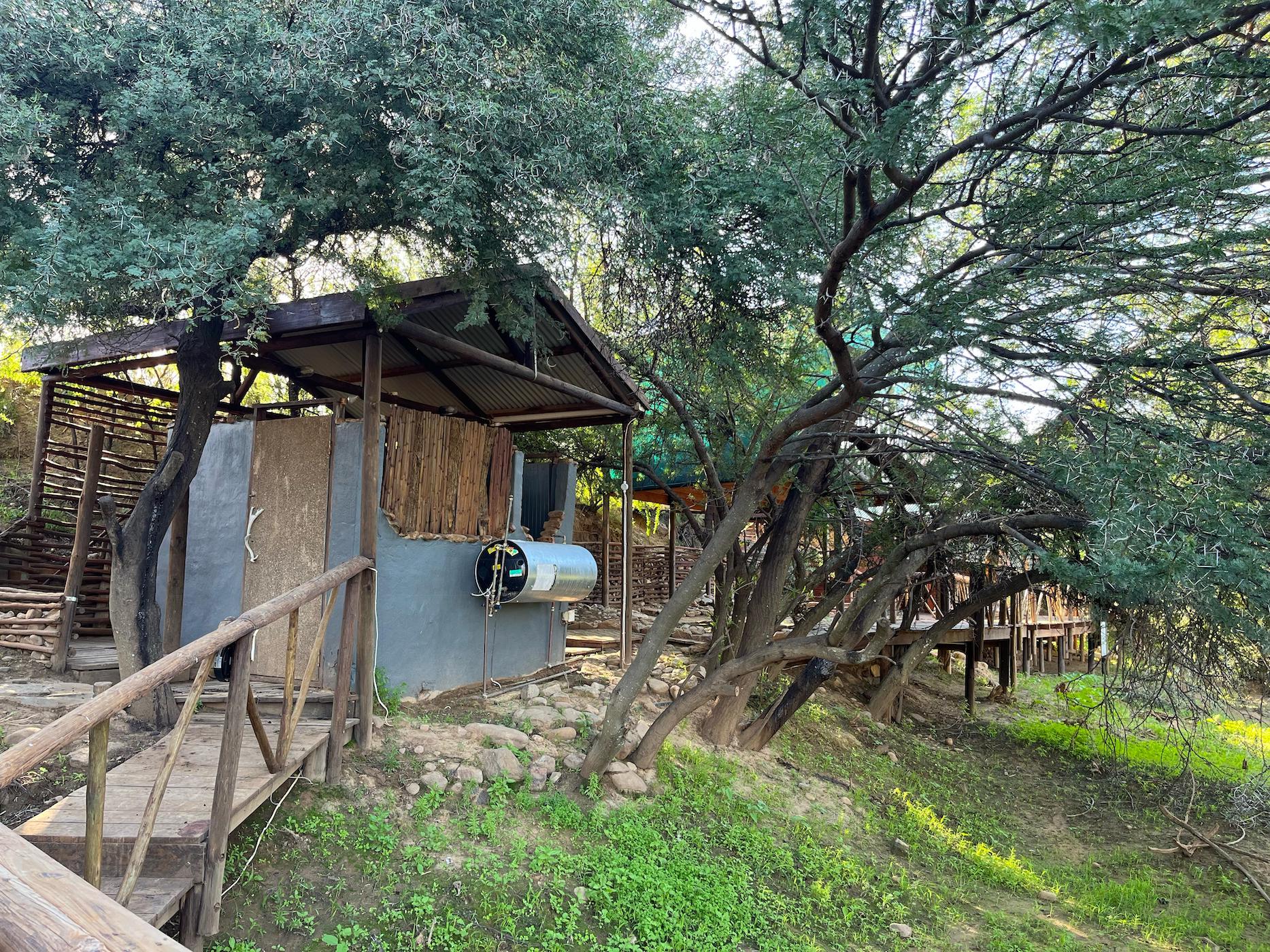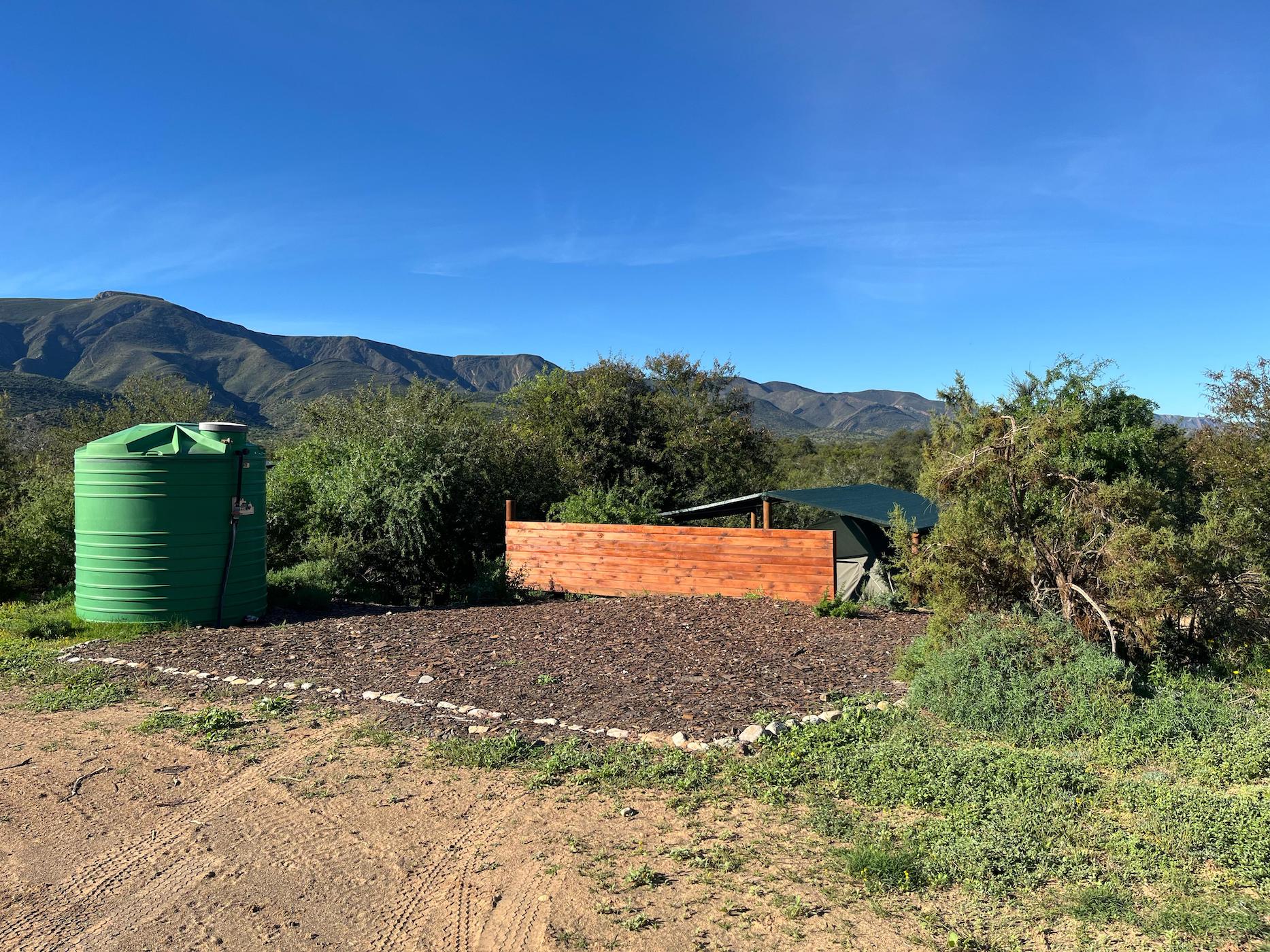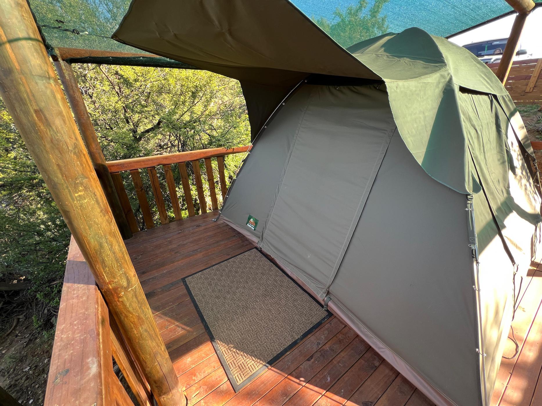 Built into the bank of the Groot River, you have to descend a few steps to get to the wooden walkways that interconnect the tents and bathrooms of this camp, while providing a lovely view across the river and down the Groot River valley.