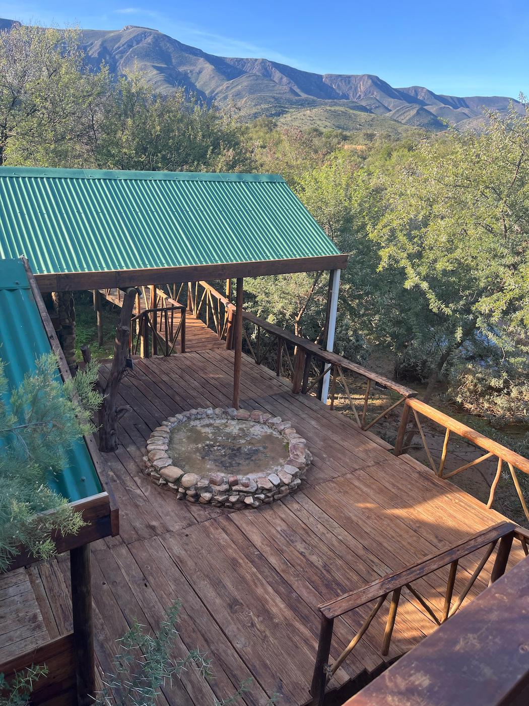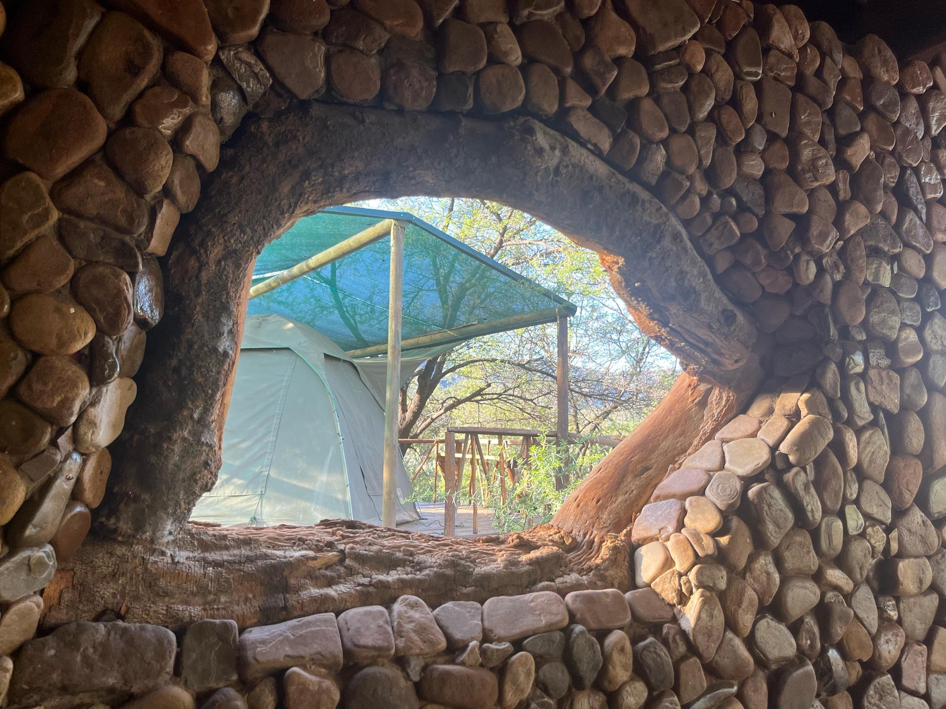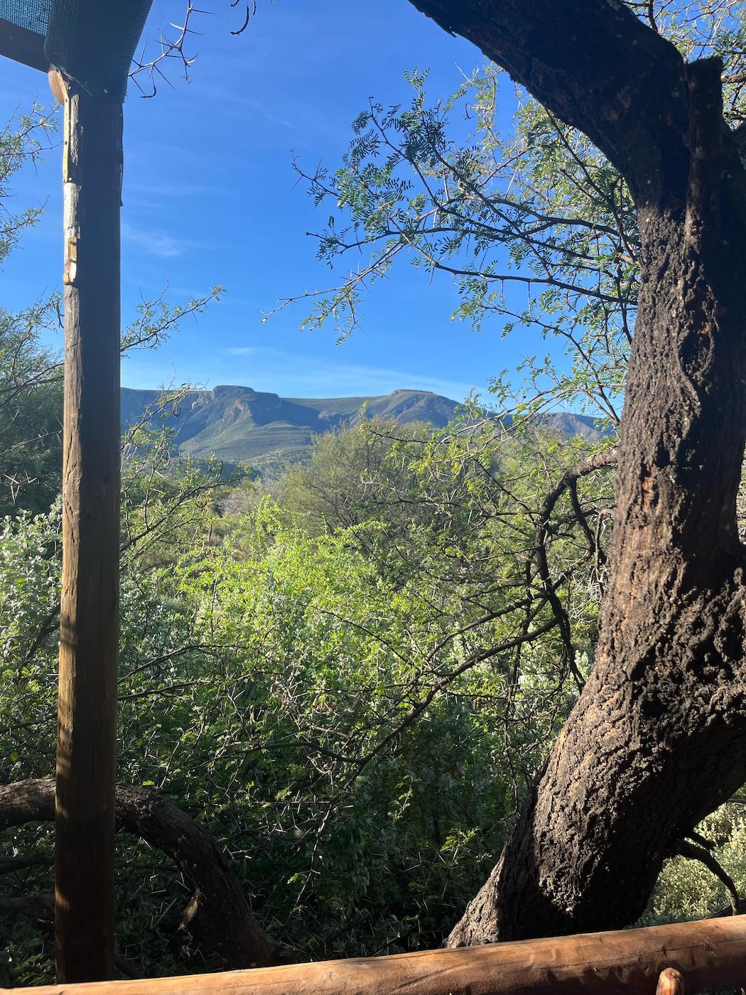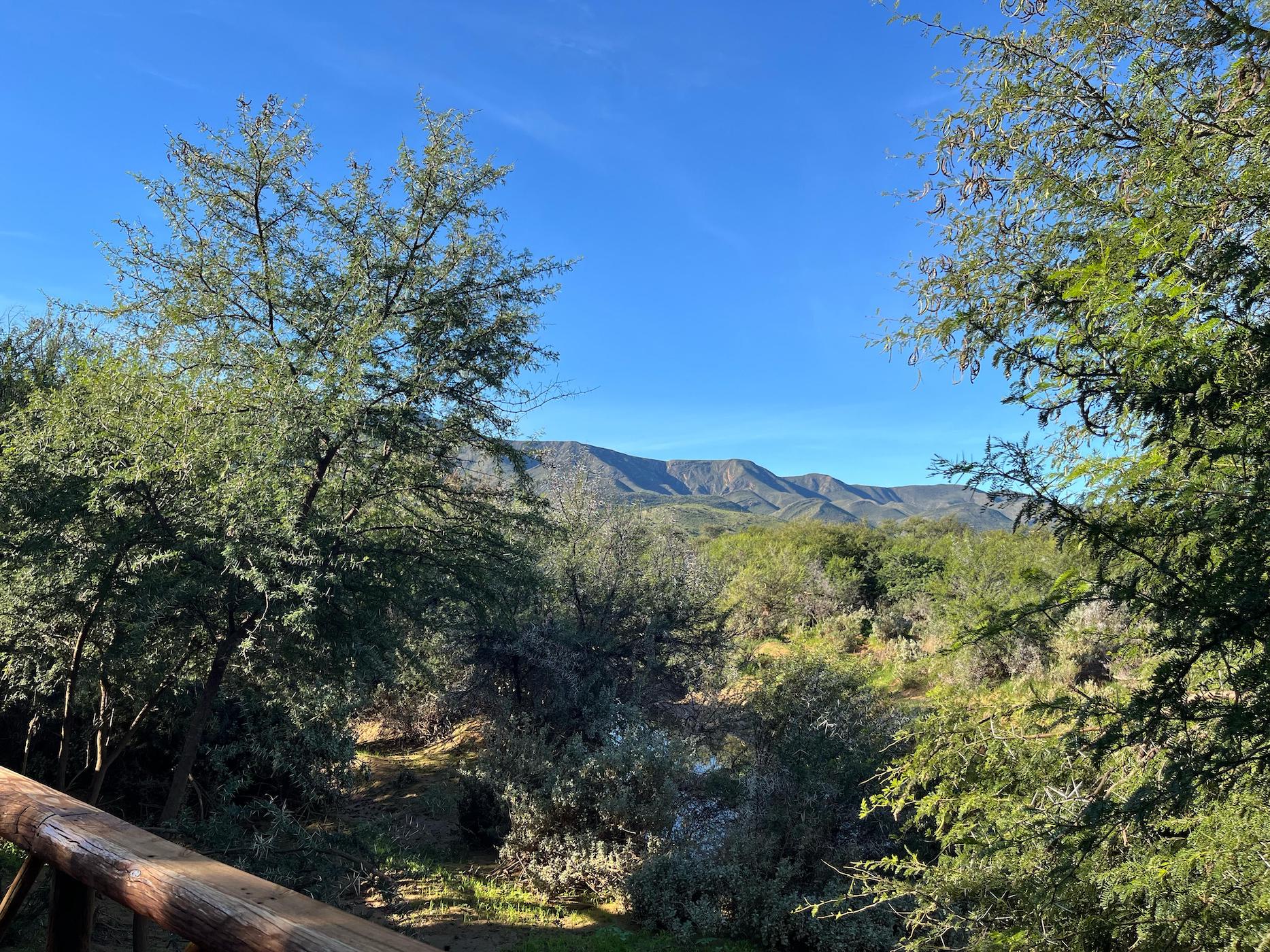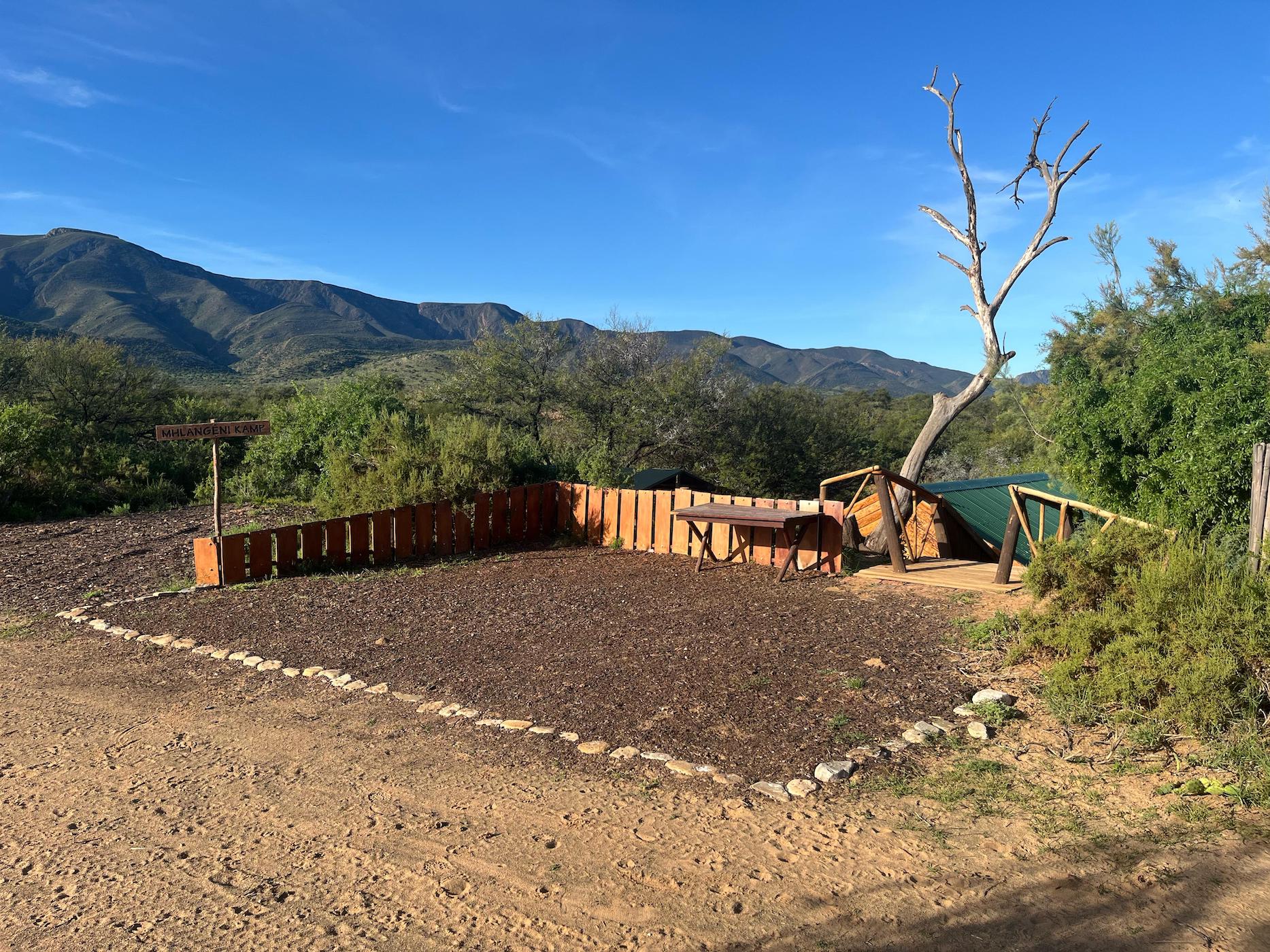 Built into the bank of the Groot River, you have to descend a few steps to get to the wooden walkways that interconnect the tents and bathrooms of this camp, while providing a lovely view across the river and down the Groot River valley.