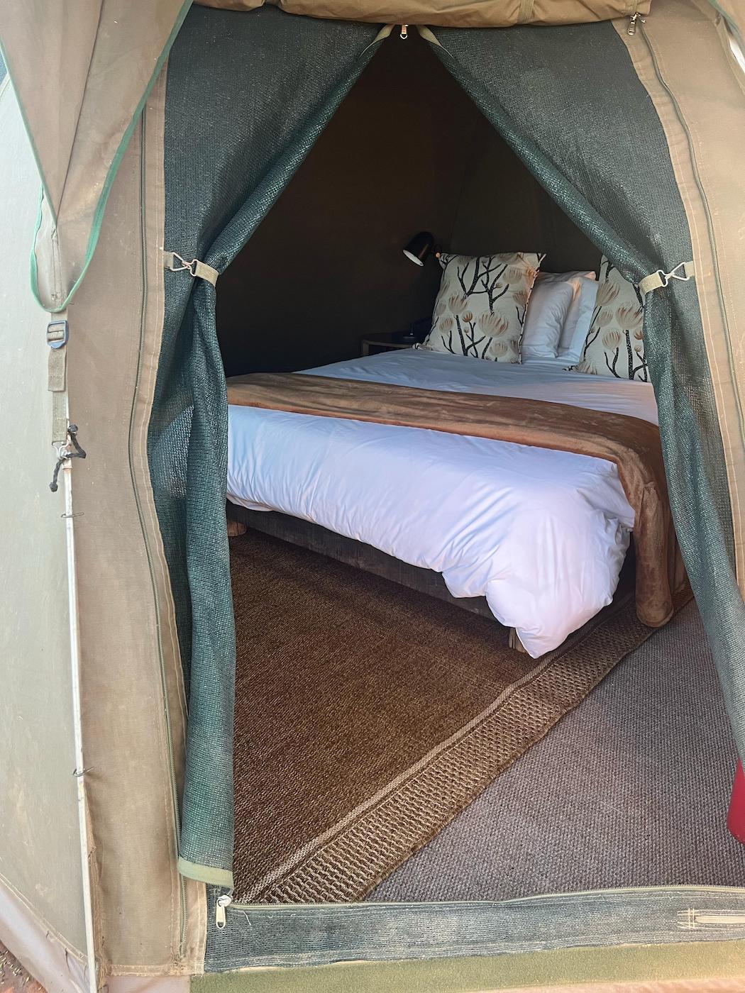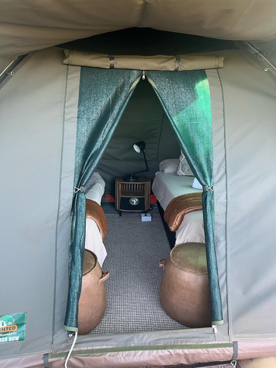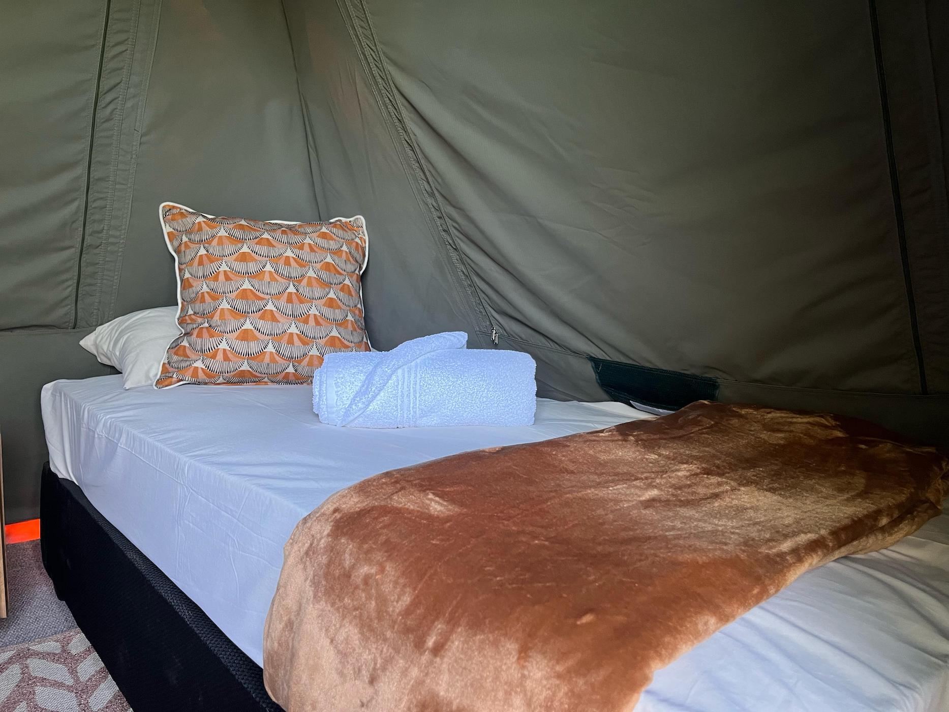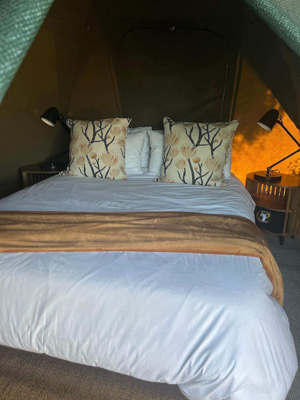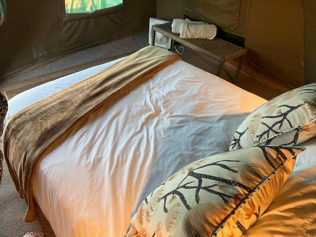 Bedding and towels are provided and all the beds have electric blankets for colder nights and each tent has a small fan for warmer nights and the bed side lamps provide sufficient light.