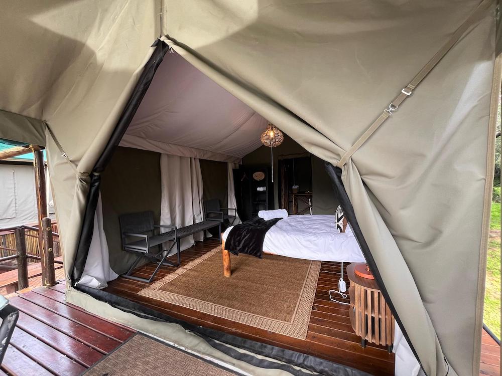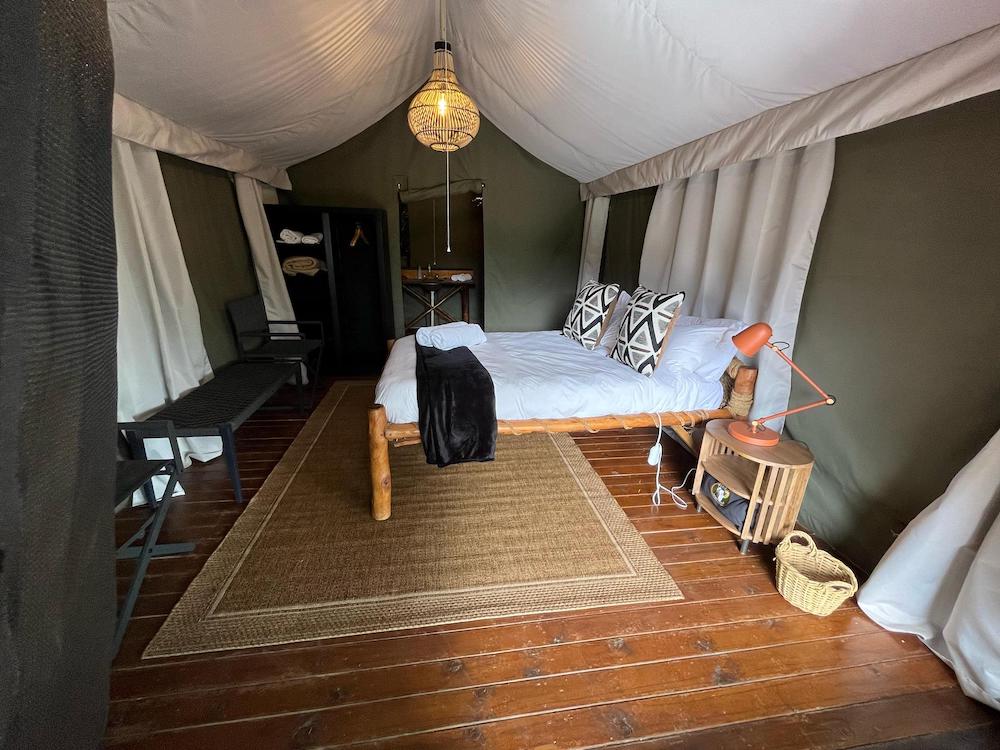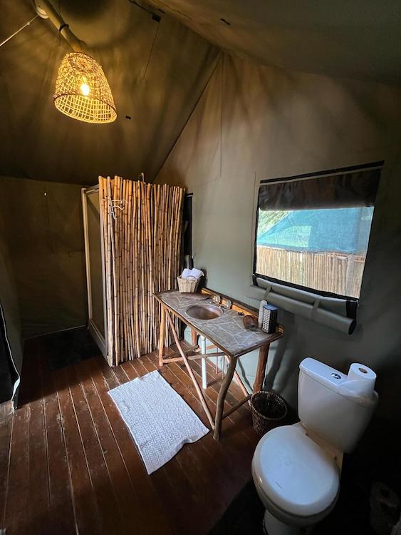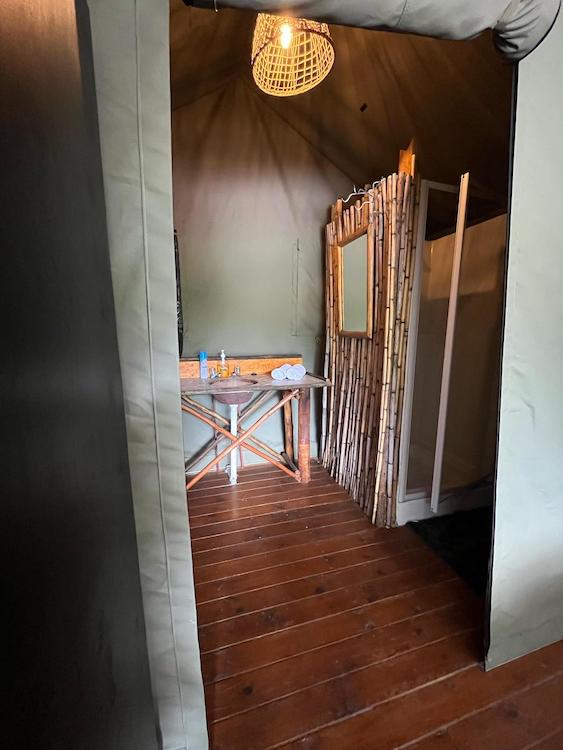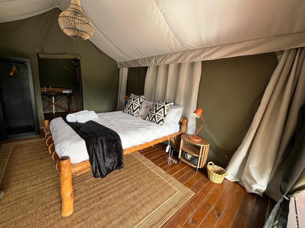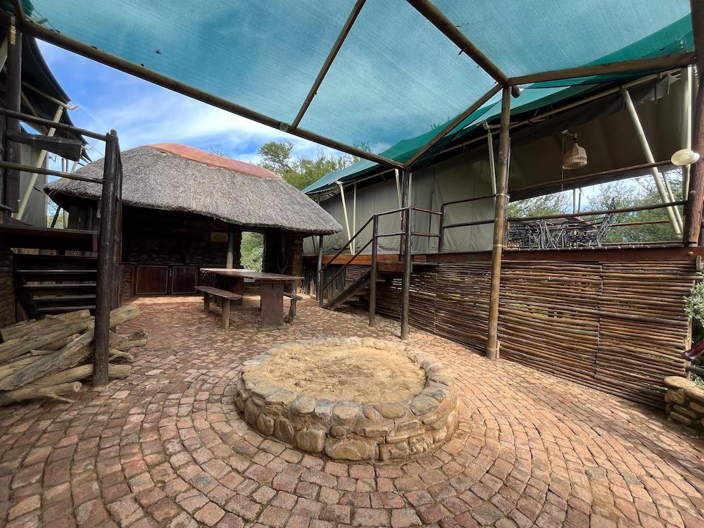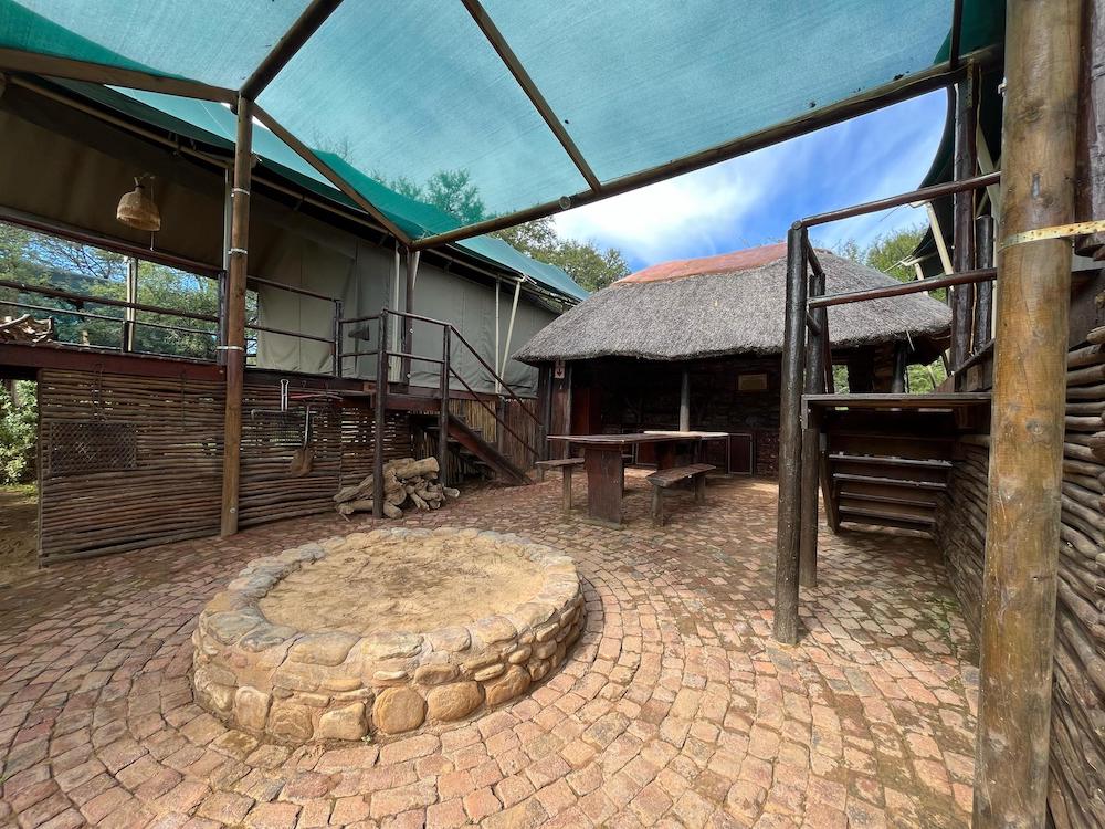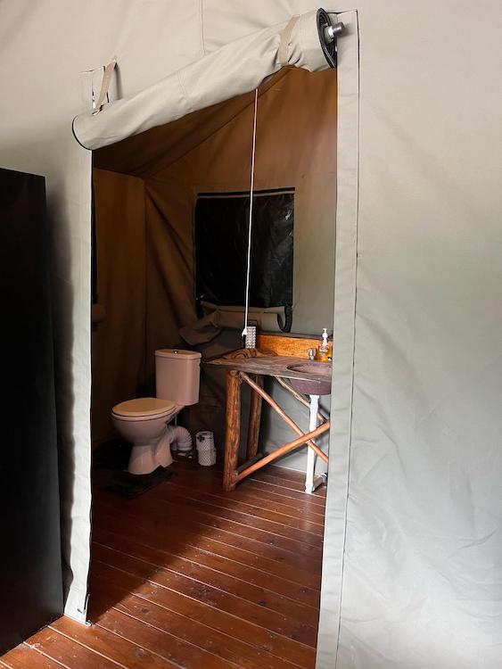 The kitchen area is a small roofed area between the 2 safari tents and provides all the kitchen basics you will need, including a fridge/freezer, microwave, 2-plate stove, kettle and toaster. A big fire pit is also situated between these tents, giving it a cozy atmosphere without detracting from the beautiful view. A long wooden bench provides ample space to sit and enjoy a meal together.