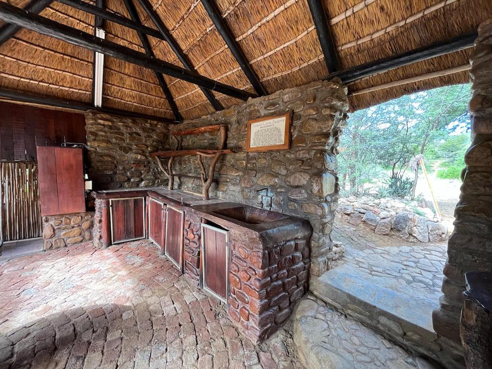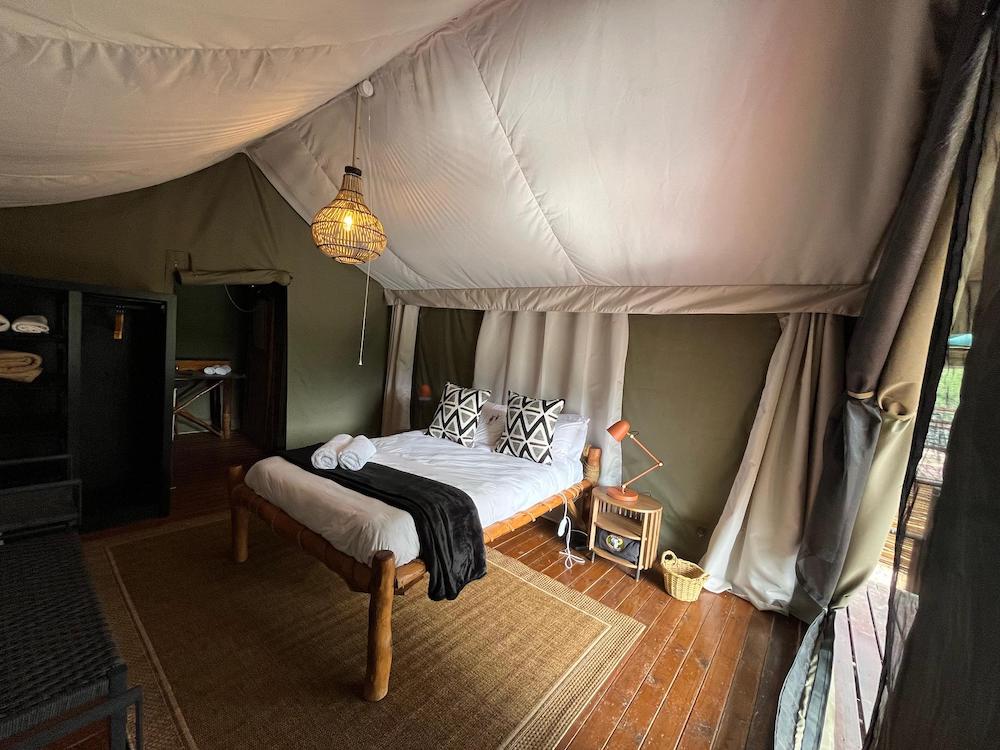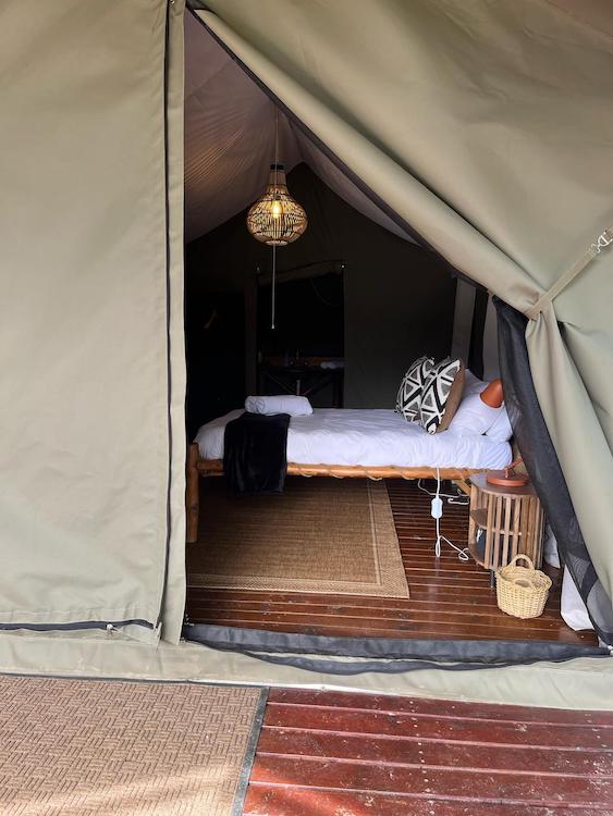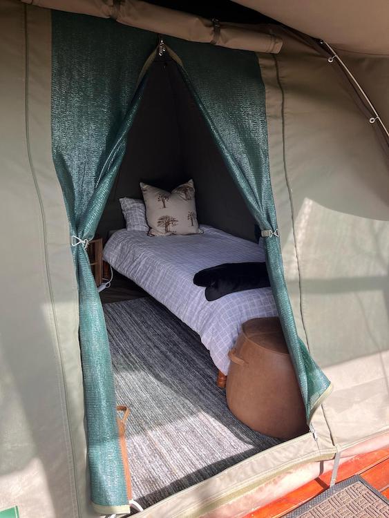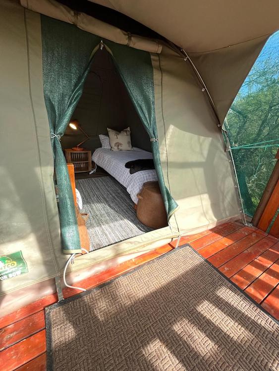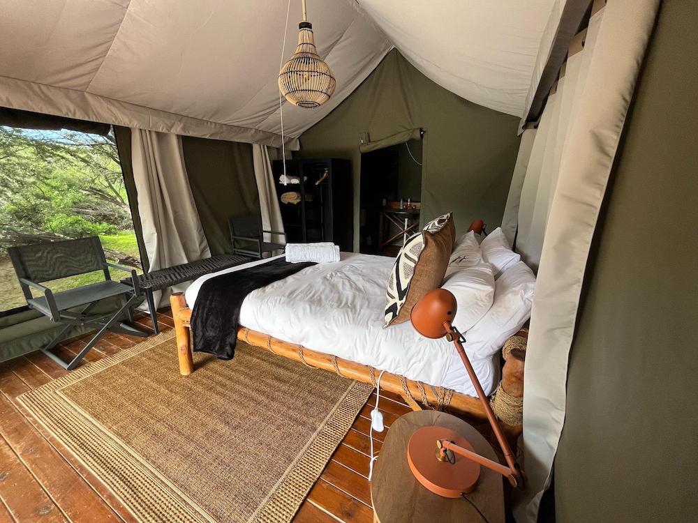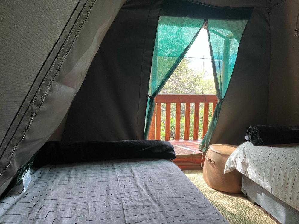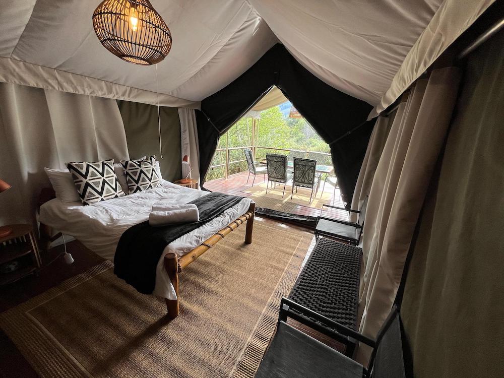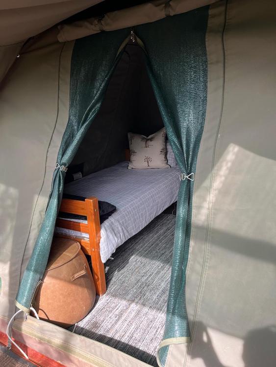 The kitchen area is a small roofed area between the 2 safari tents and provides all the kitchen basics you will need, including a fridge/freezer, microwave, 2-plate stove, kettle and toaster. A big fire pit is also situated between these tents, giving it a cozy atmosphere without detracting from the beautiful view. A long wooden bench provides ample space to sit and enjoy a meal together.
