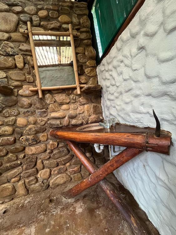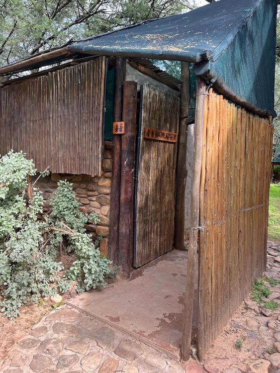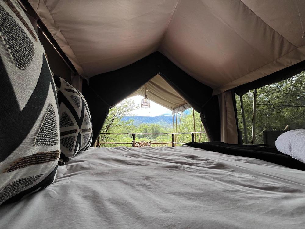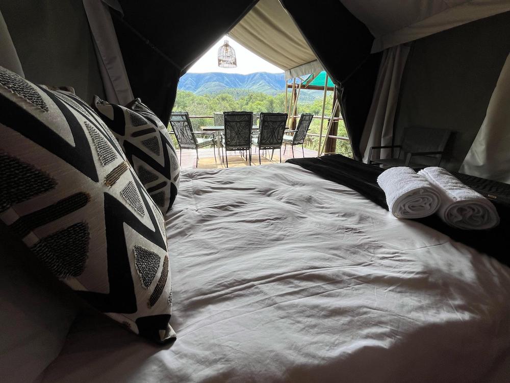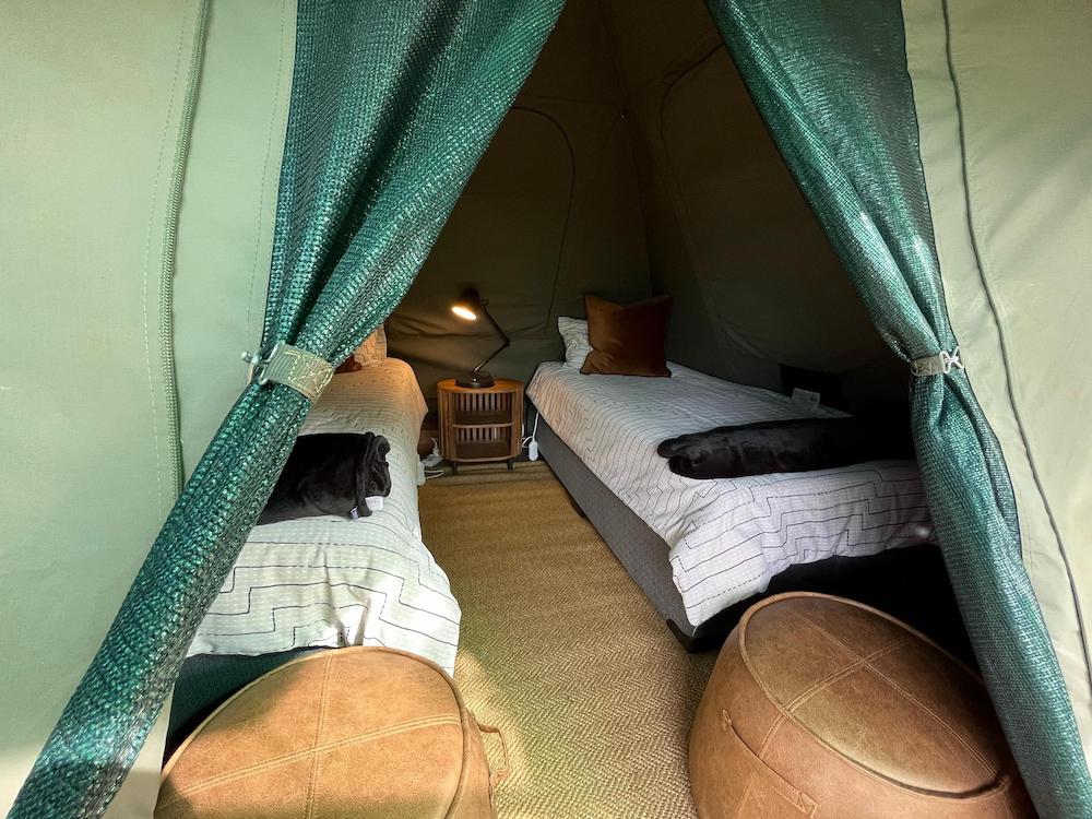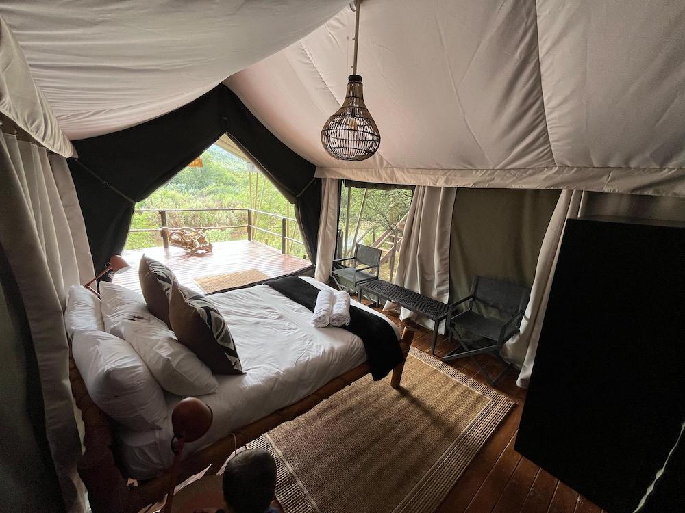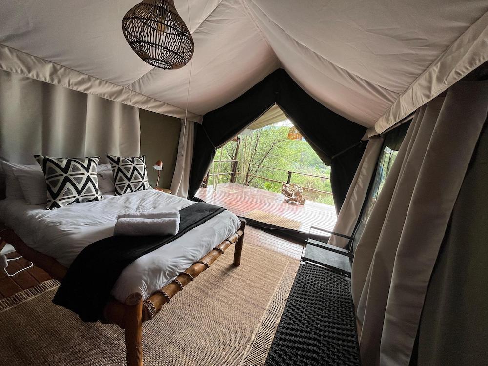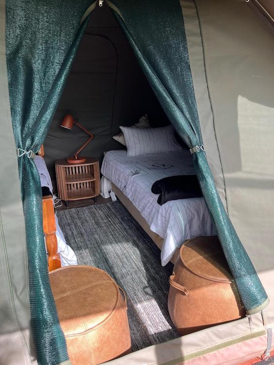 The kitchen area is a small roofed area between the 2 safari tents and provides all the kitchen basics you will need, including a fridge/freezer, microwave, 2-plate stove, kettle and toaster. A big fire pit is also situated between these tents, giving it a cozy atmosphere without detracting from the beautiful view. A long wooden bench provides ample space to sit and enjoy a meal together.